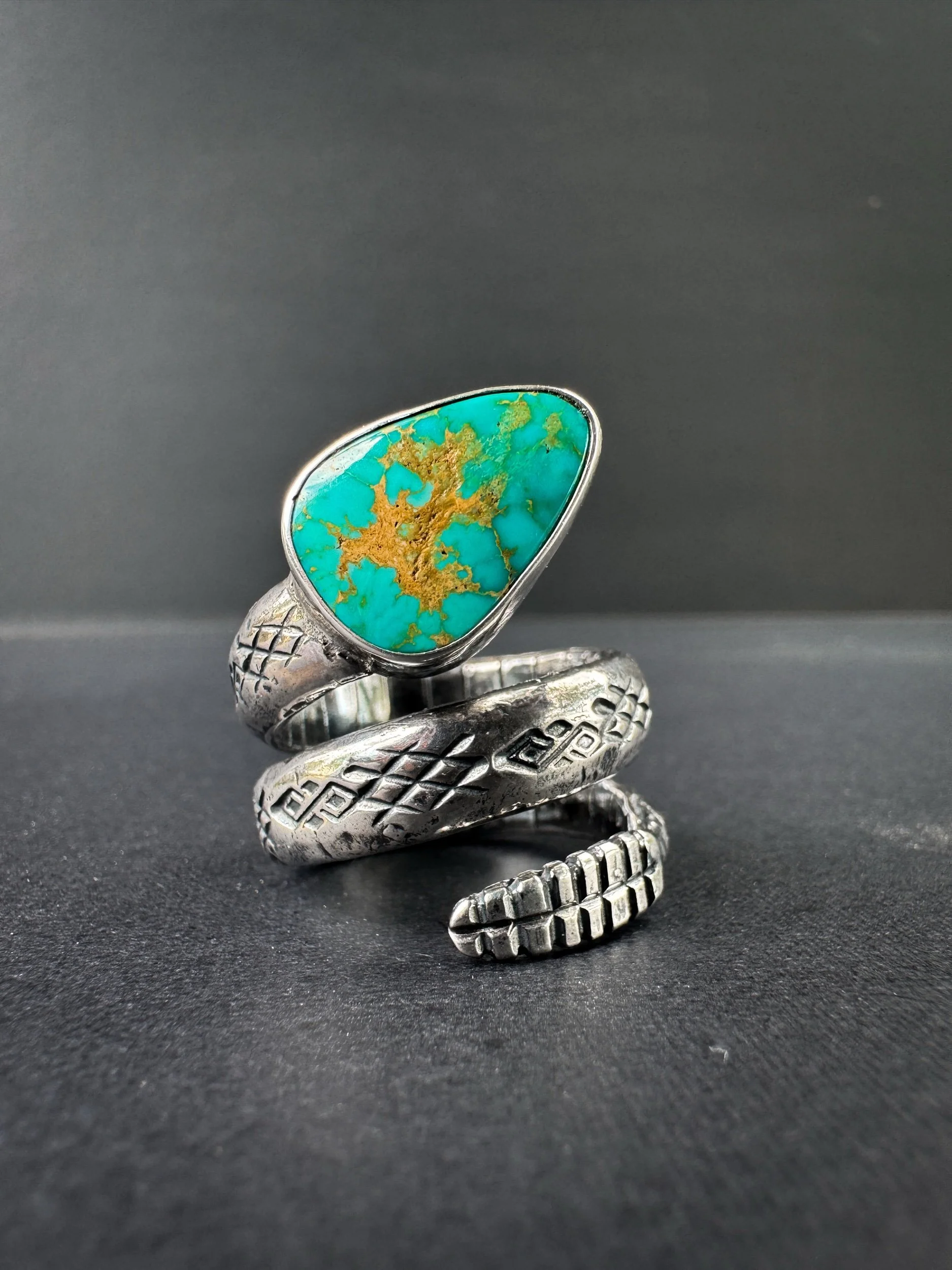 This rattlesnake ring is designed in the same style as the Brim Biter, only it’s 3x the weight and chunkiness. This ring is handmade with natural Stone Mountain turquoise from Nevada, a .999 fine silver bezel, and solid sterling silver body.