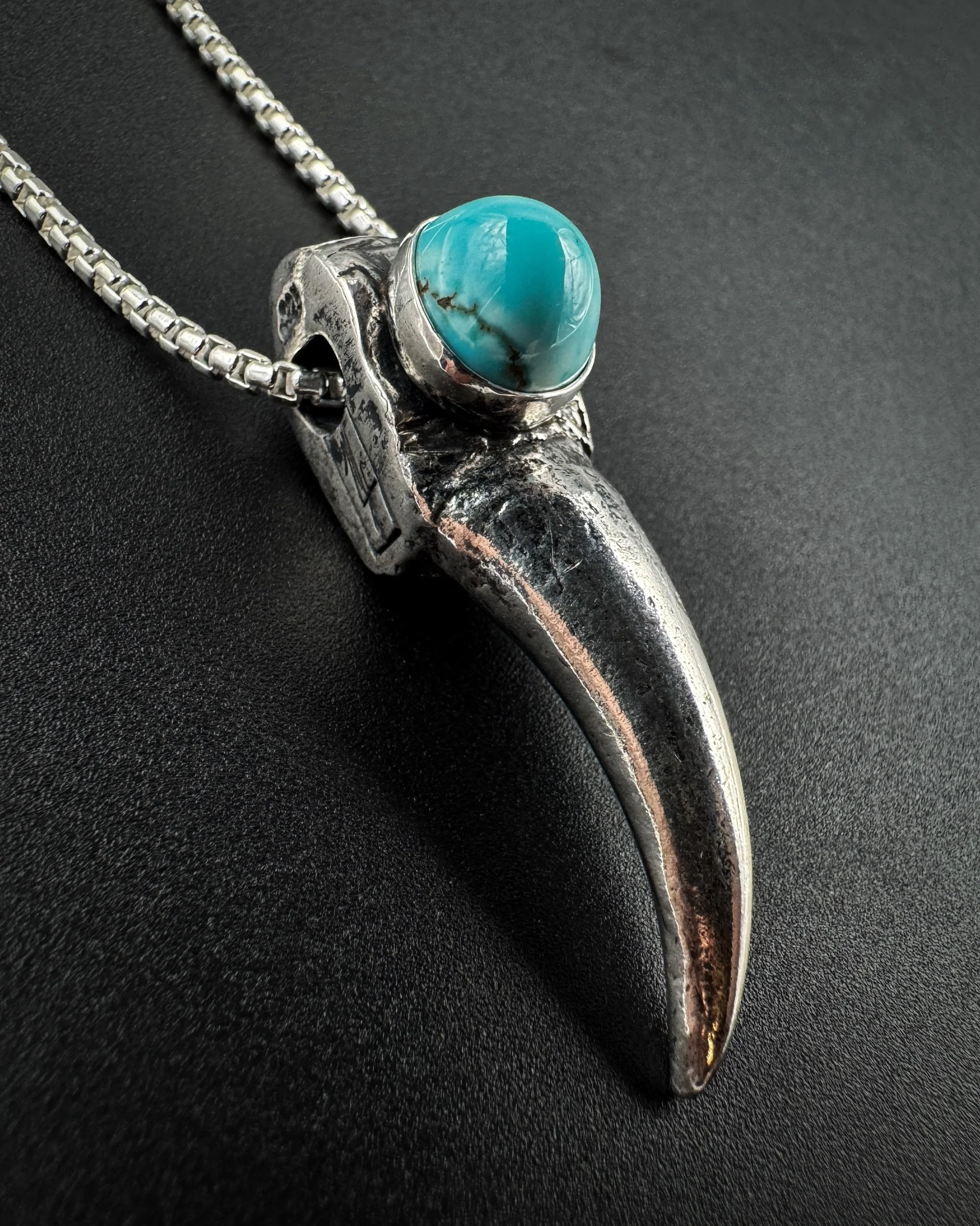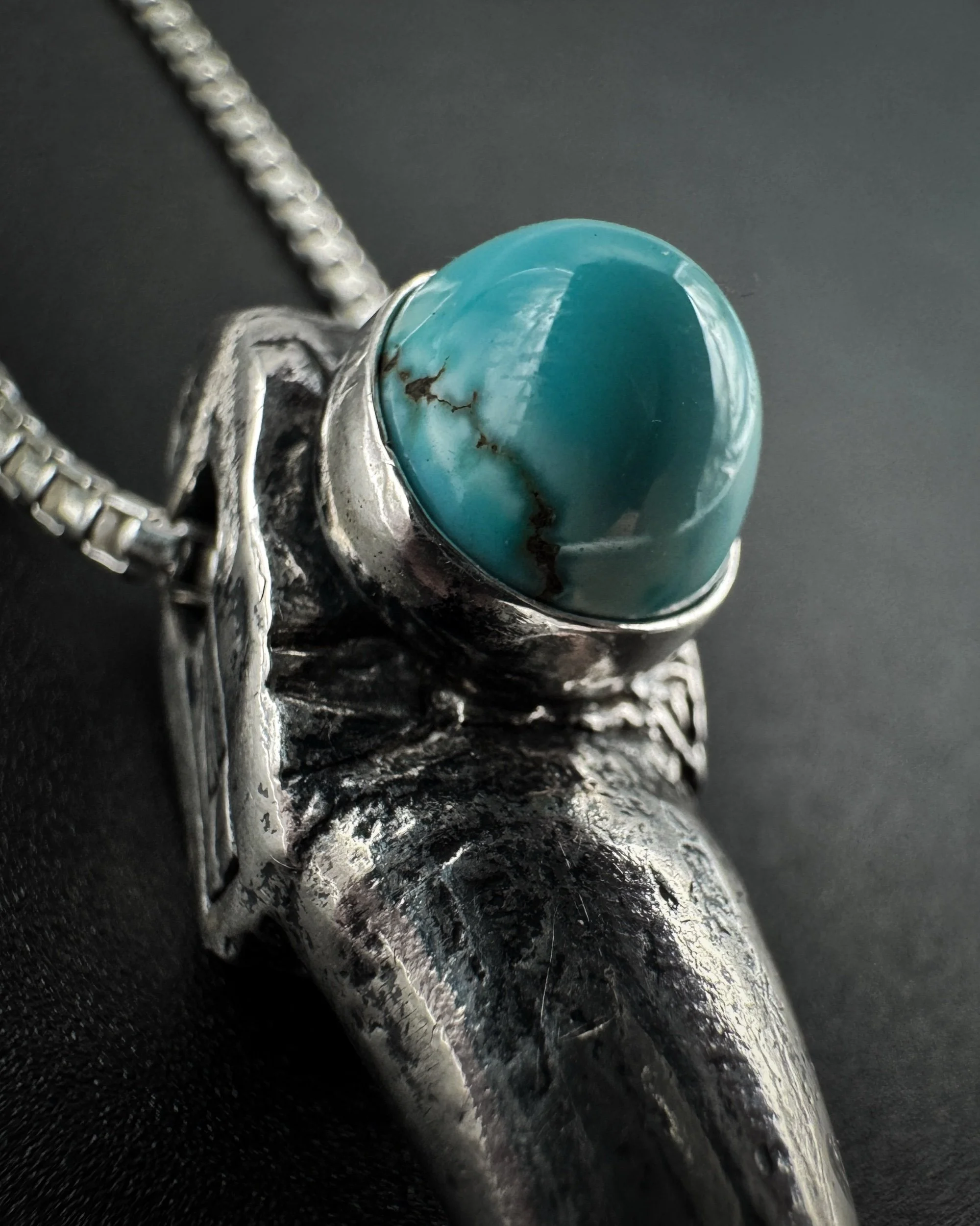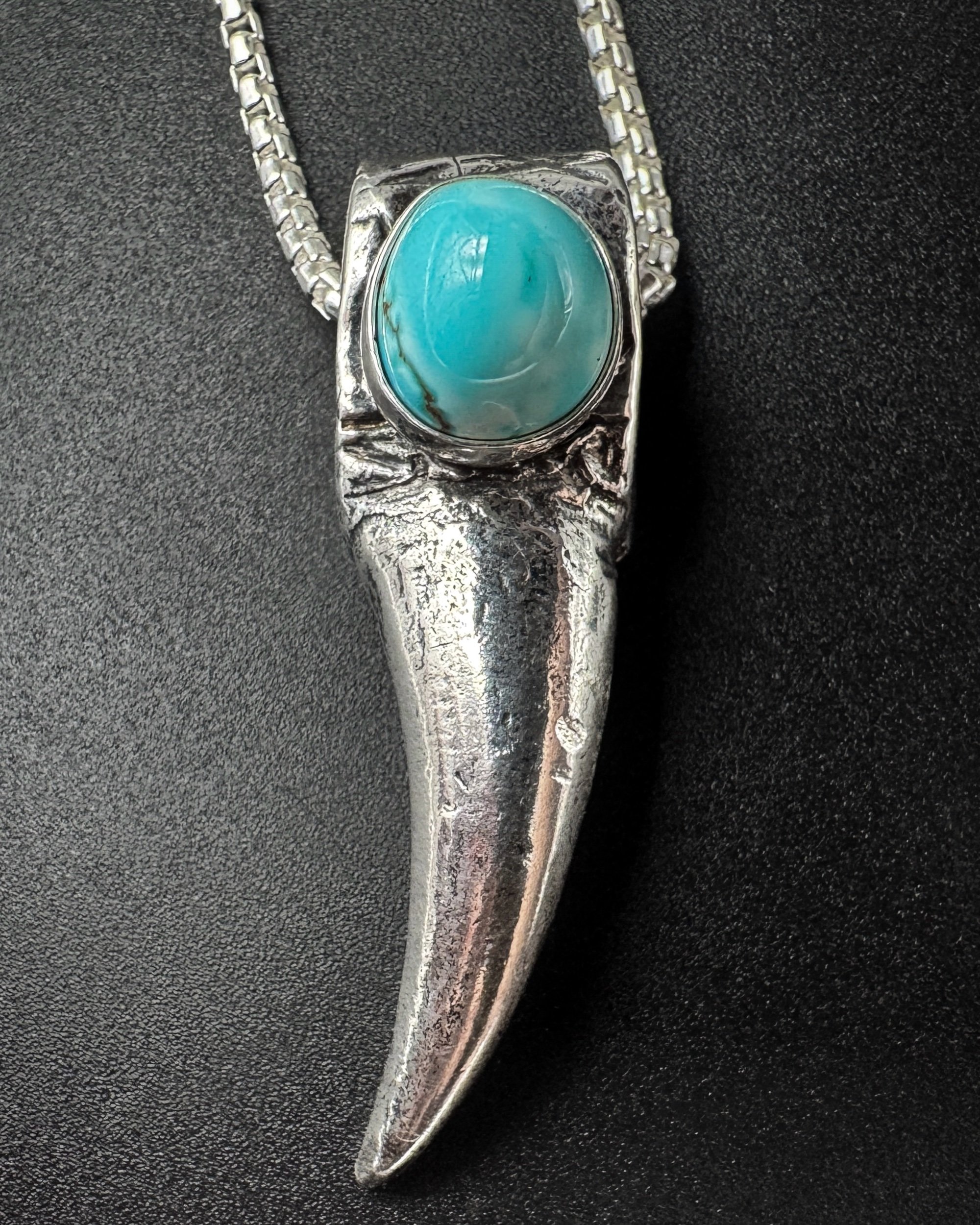 This solid .925 sterling silver turkey spur pendant is cast after a real turkey spur and set with natural loan mountain Turquoise Bezold in .999 fine silver. This spur is the right spur. The left spur is listed separately.
