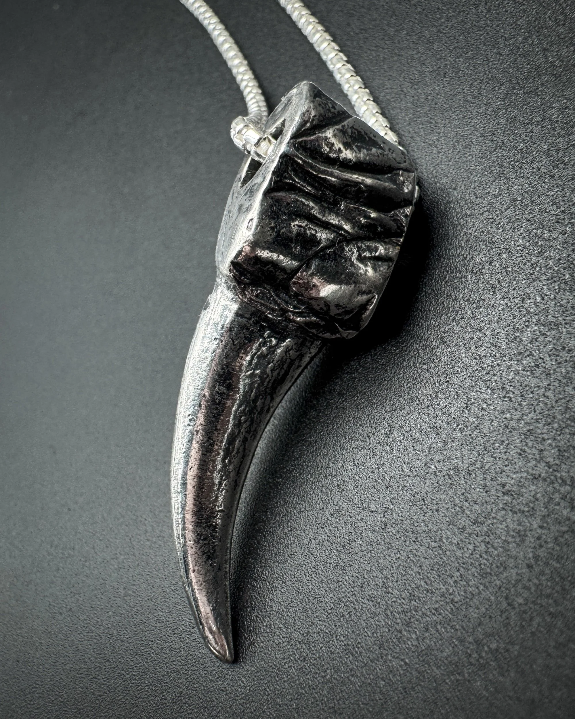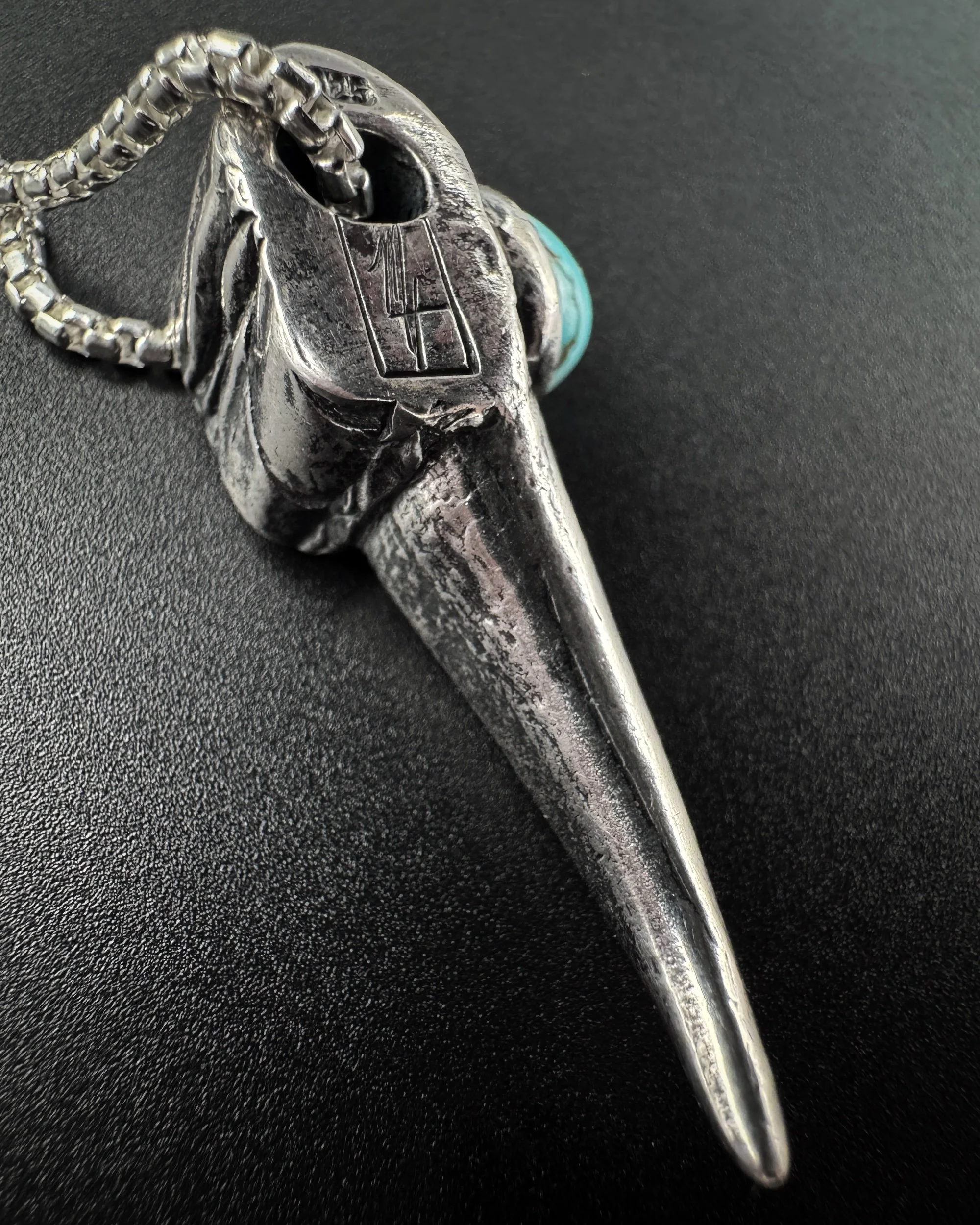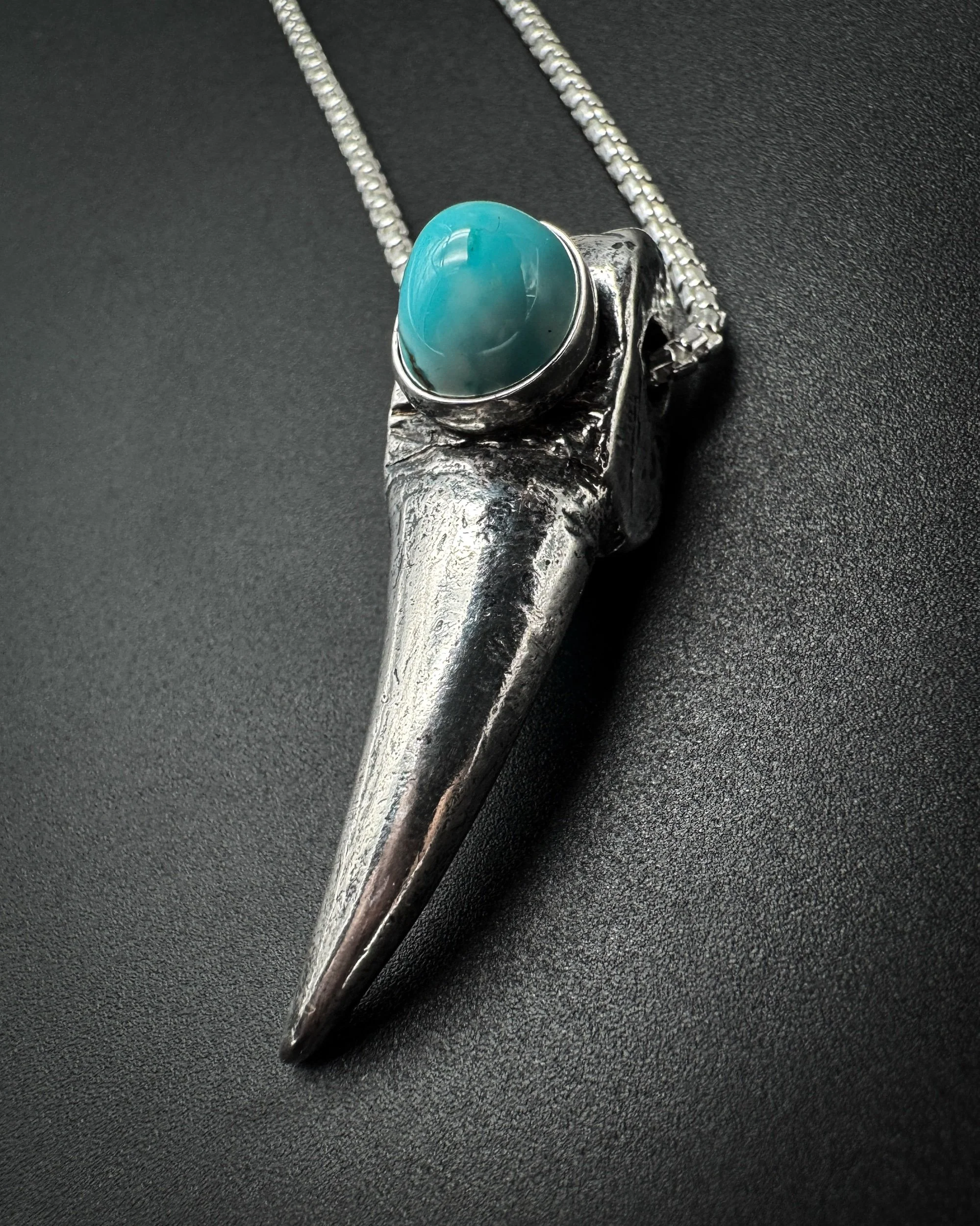 This solid .925 sterling silver turkey spur pendant is cast after a real turkey spur and set with natural loan mountain Turquoise Bezold in .999 fine silver. This spur is the right spur. The left spur is listed separately.