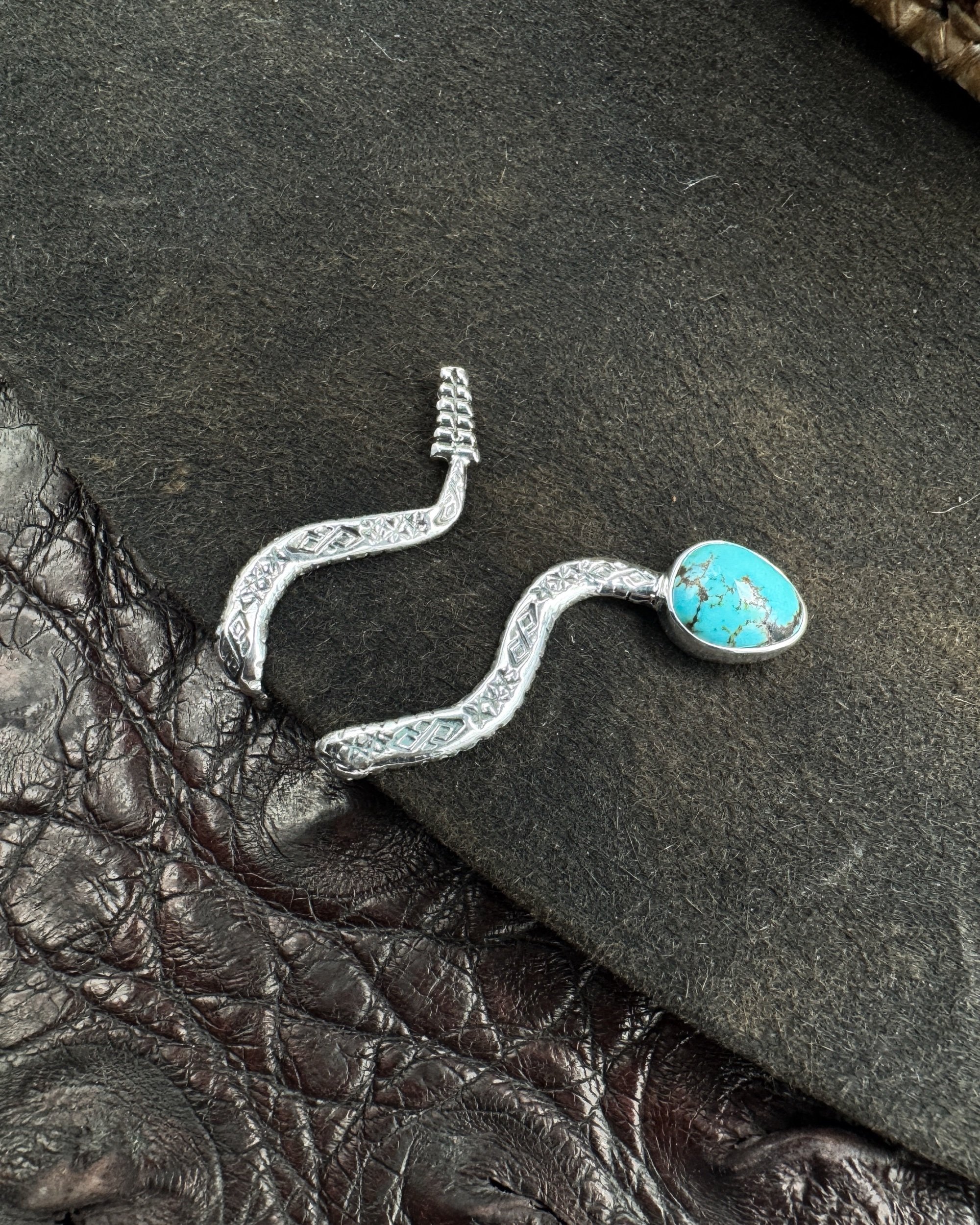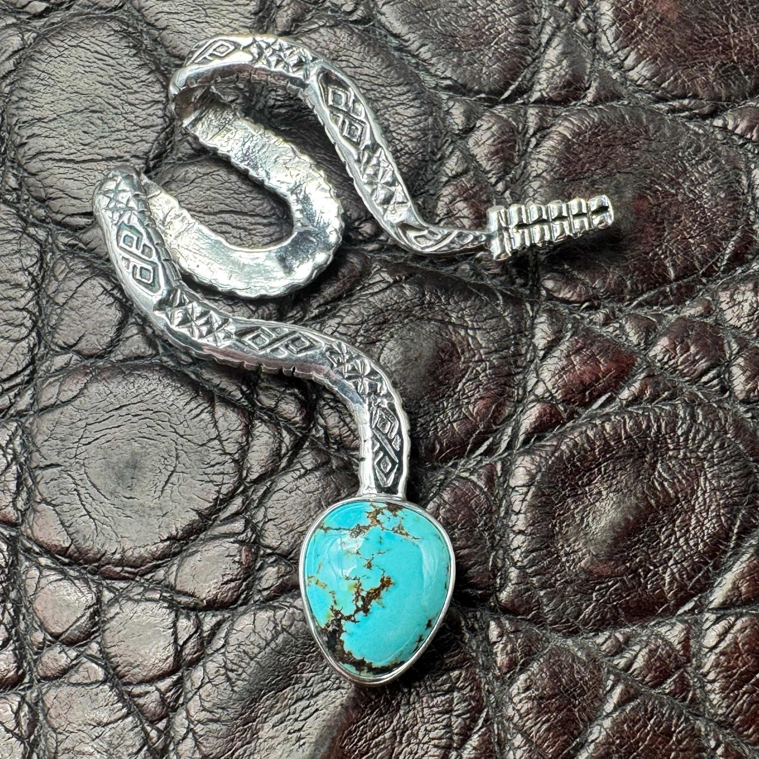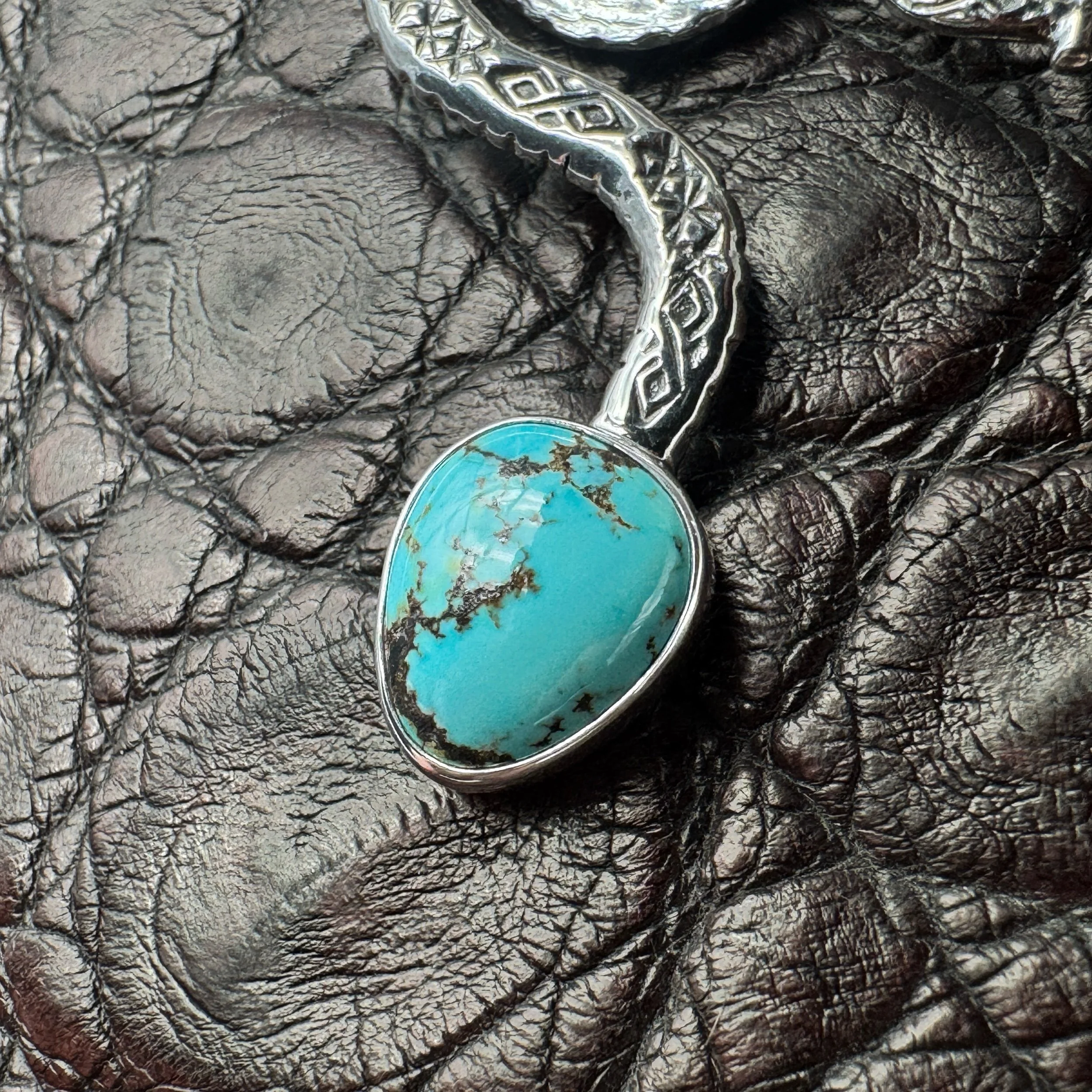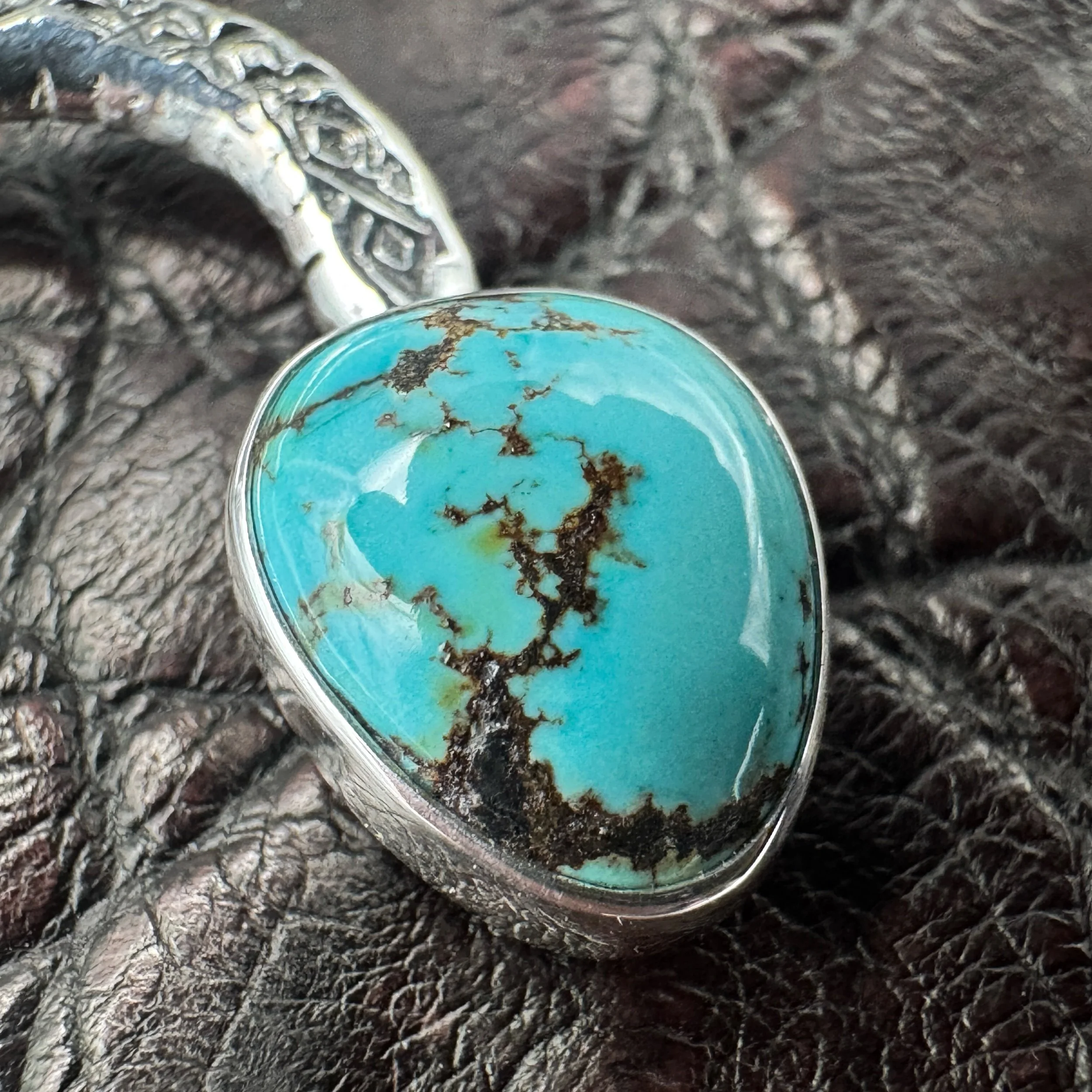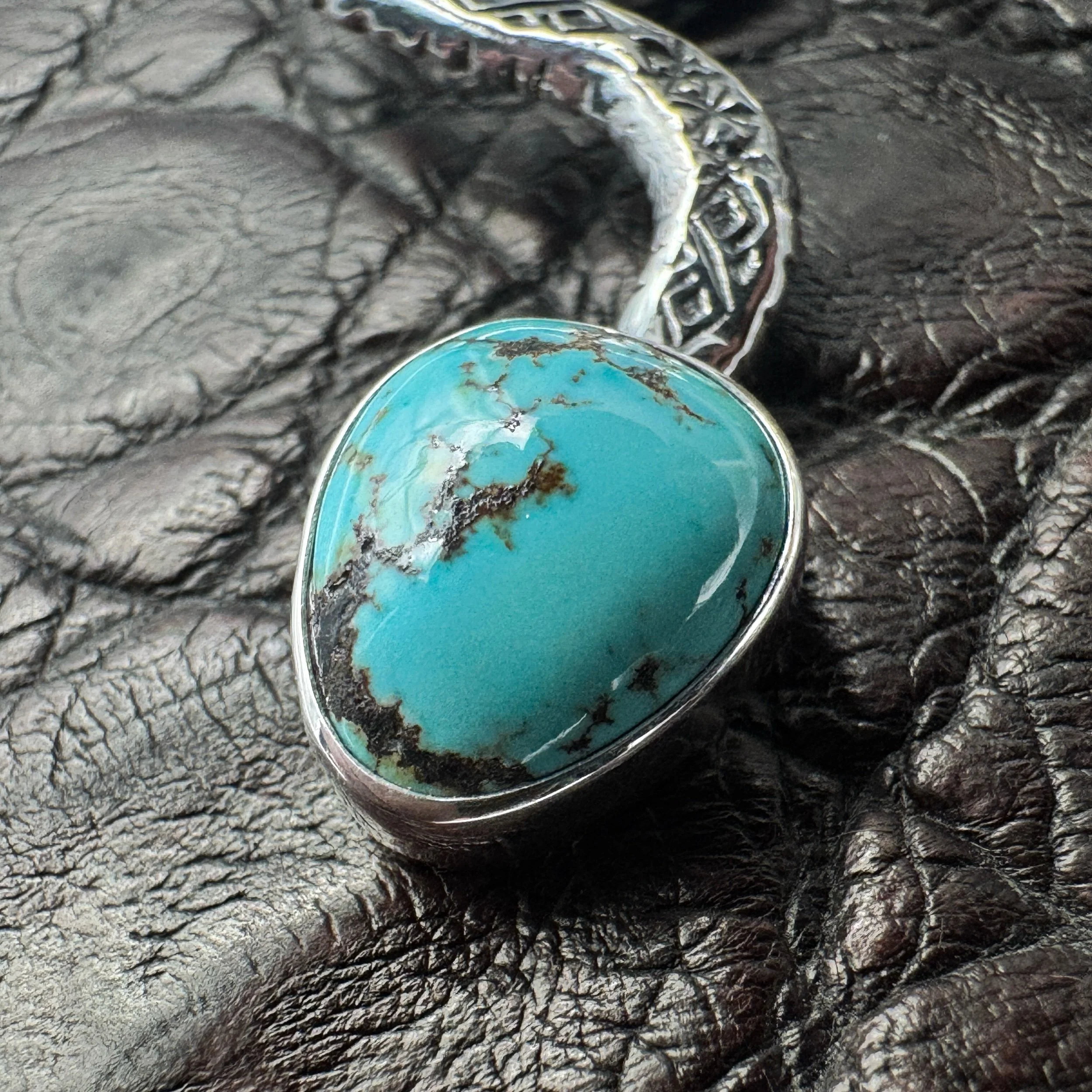 Handmade with solid .925 sterling silver, a .999 fine silver bezel and rare, high-grade, natural Indian Mountain turquoise from Nevada that’s an absolutely glowing light-blue with an exceptional dark-brown fine line matrix.