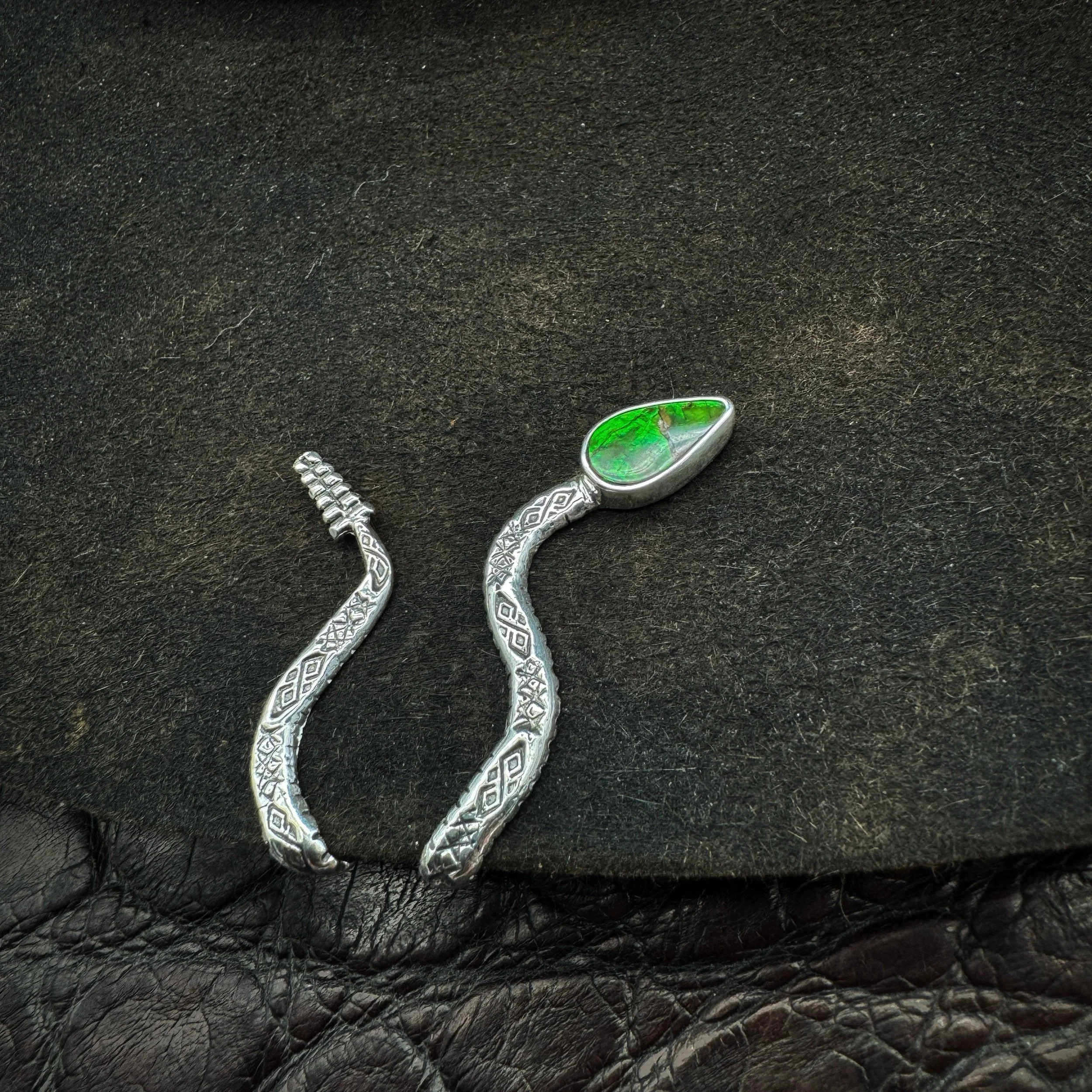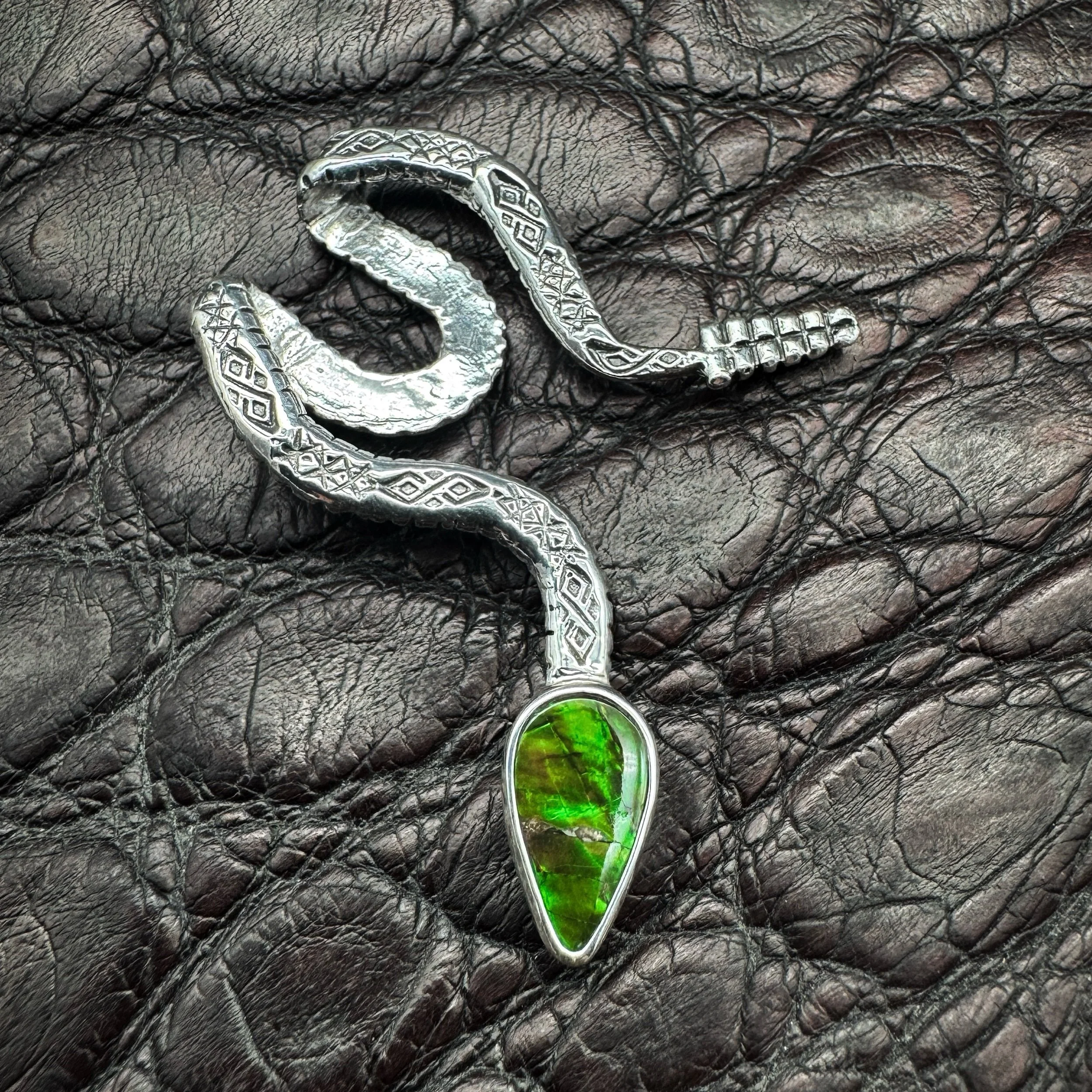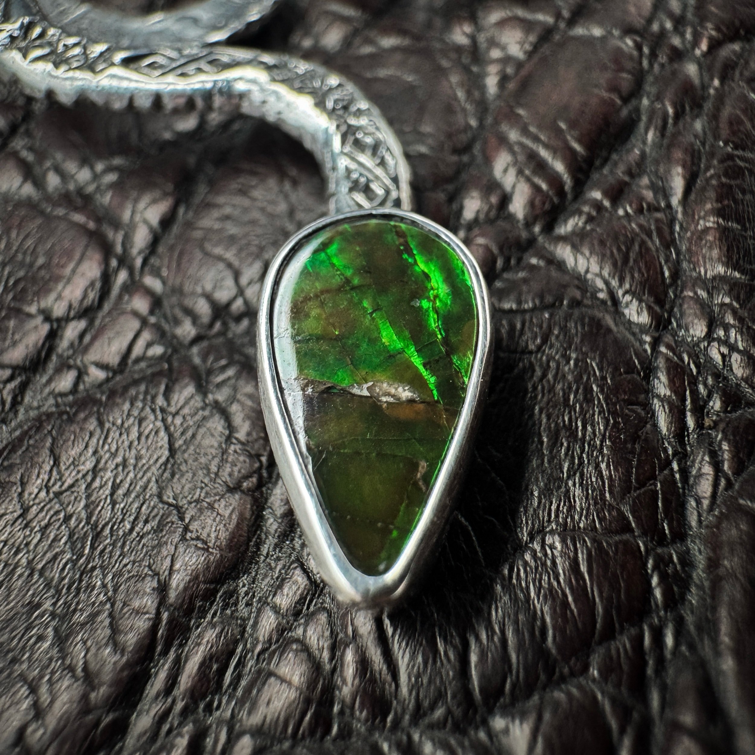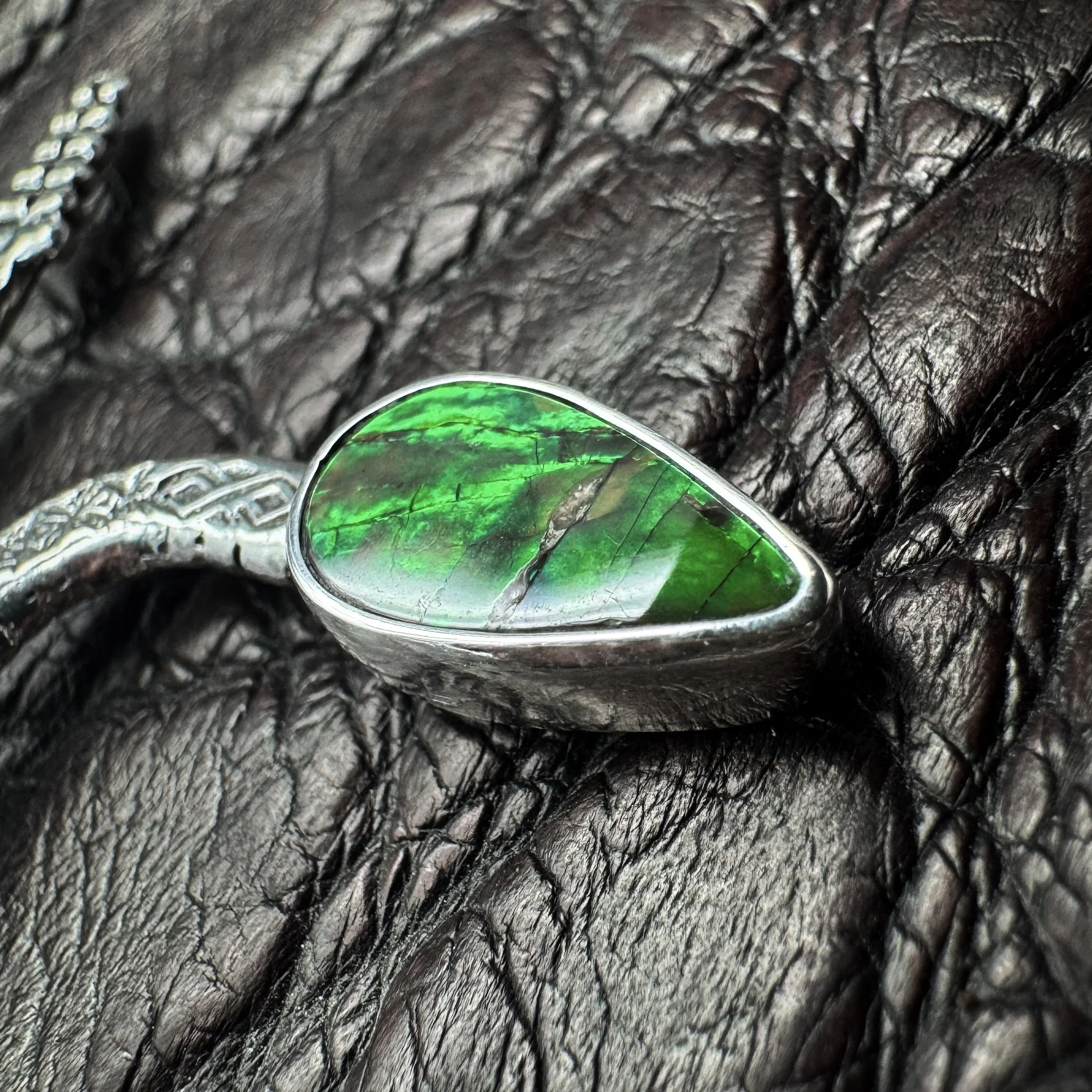 This piece is as unique and one of a kind as it gets. Ammolite comes from the fossilized shells of extinct ammonites, and its color isn’t pigment at all, its structural color. Light bends and reflects through microscopic layers of aragonite, creating that electric green flash. In other words, you’re not just seeing color… you’re seeing millions of years of geological structure interacting with light.