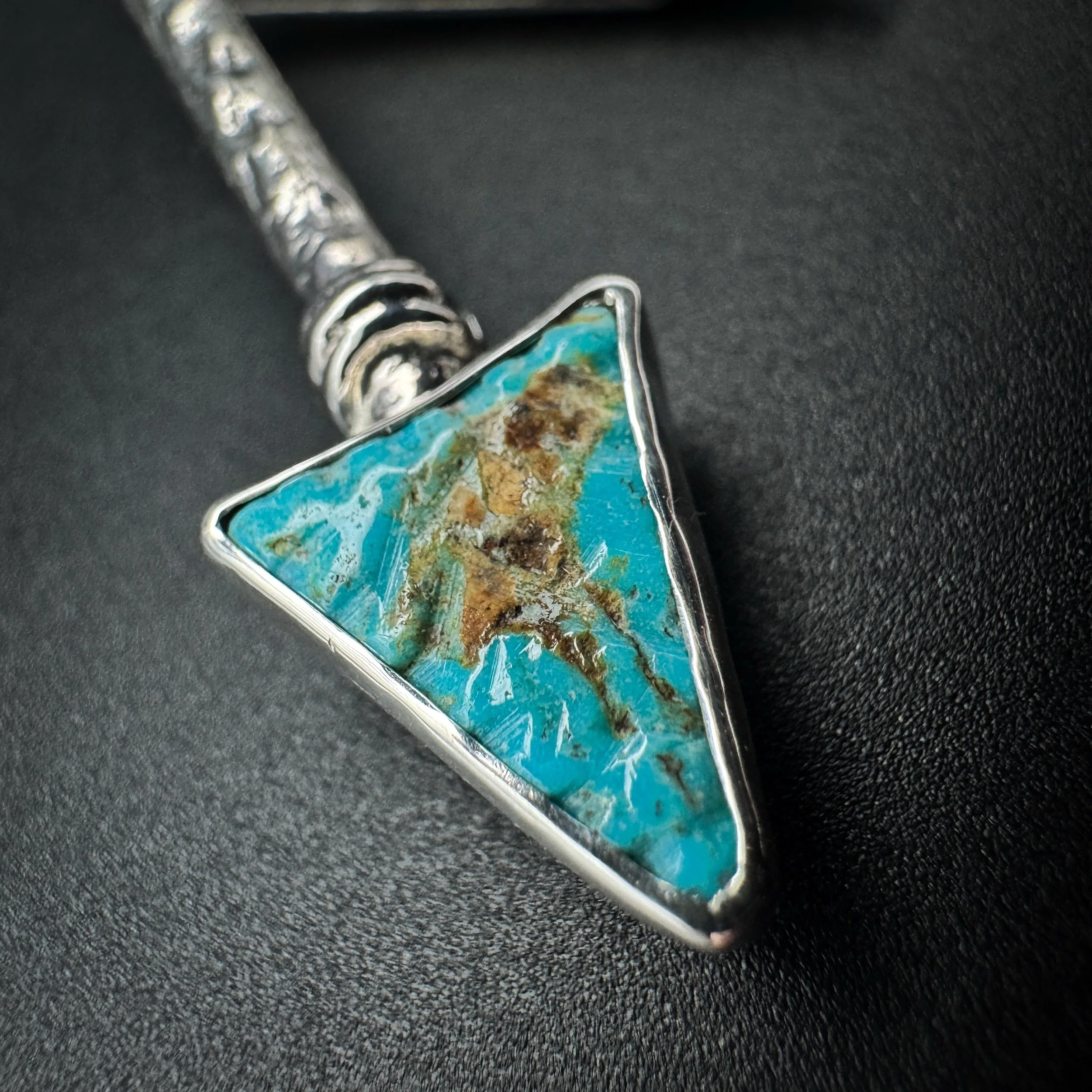 This Broken Arrow Brim Biter® is handmade with Cripple Creek Turquoise, a .925 sterling silver body, and a .999 fine silver bezel.