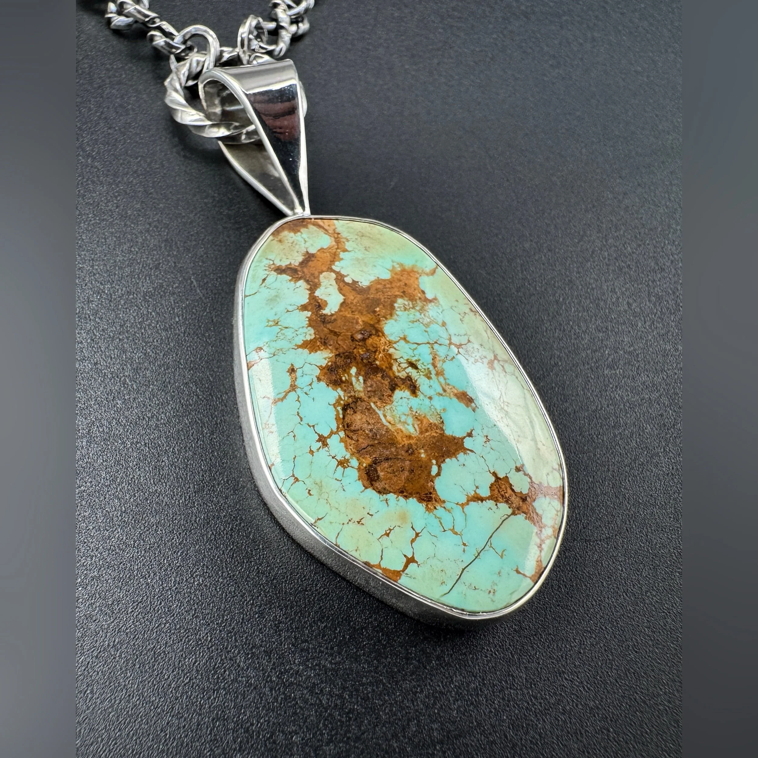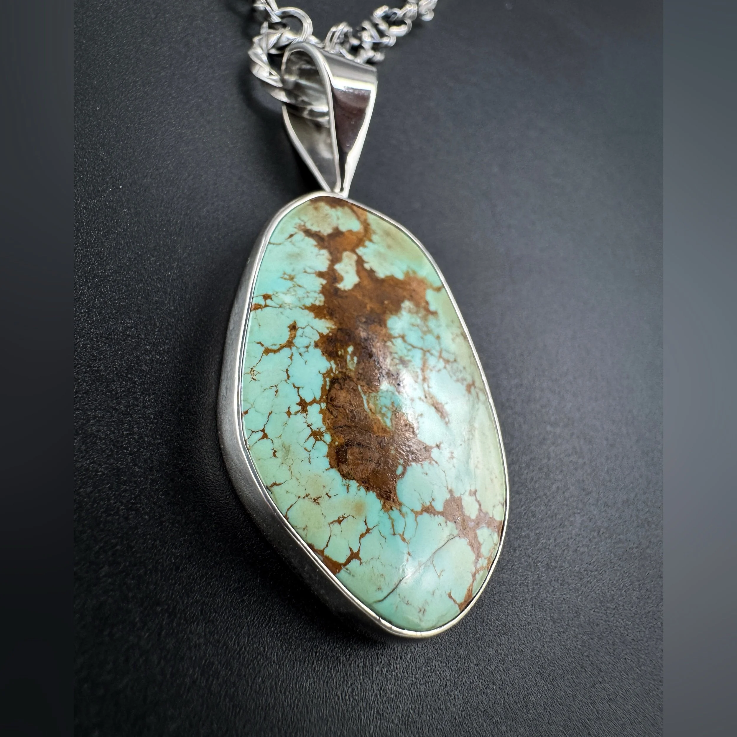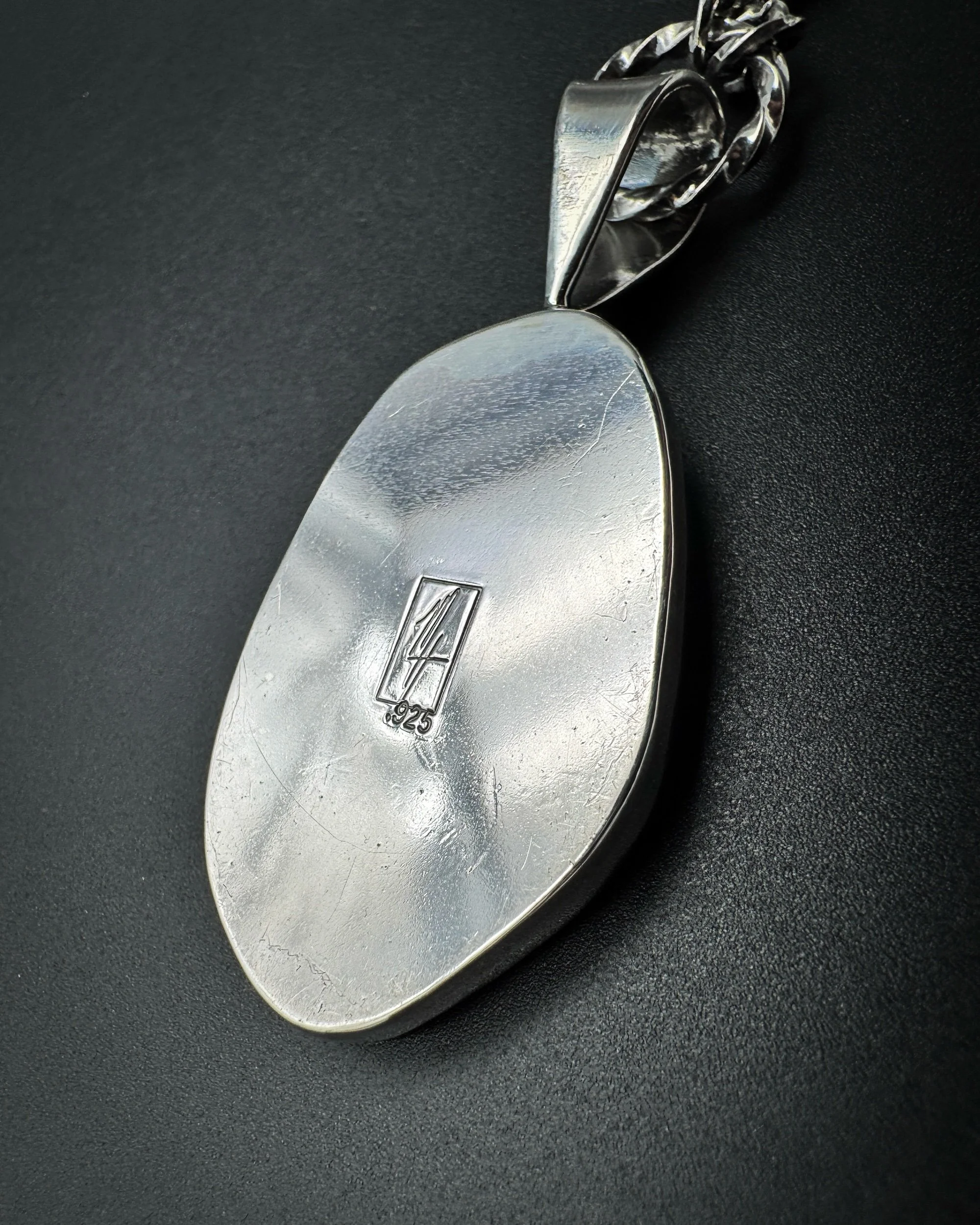 The stone is bezeled in .999 fine silver with a sterling silver back.