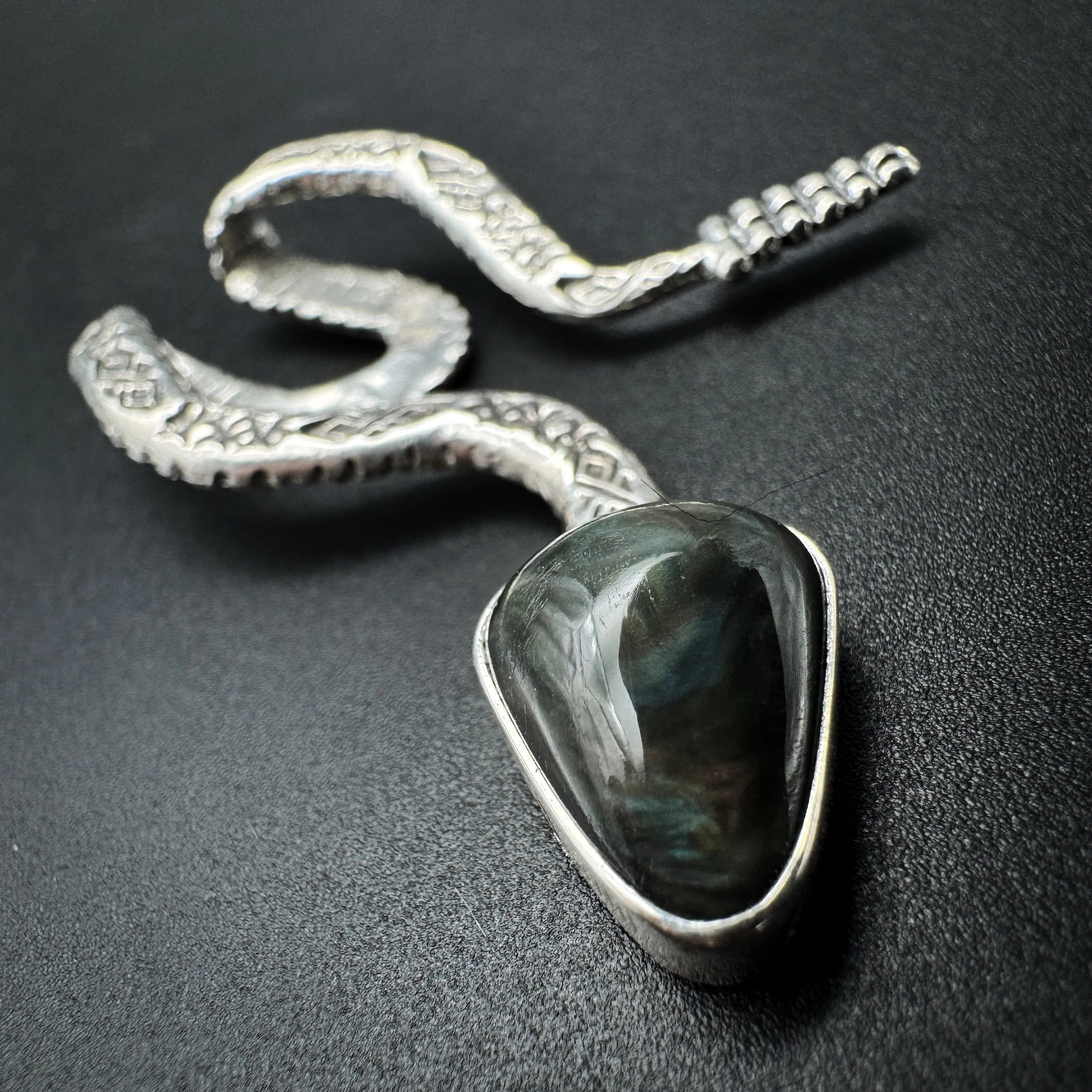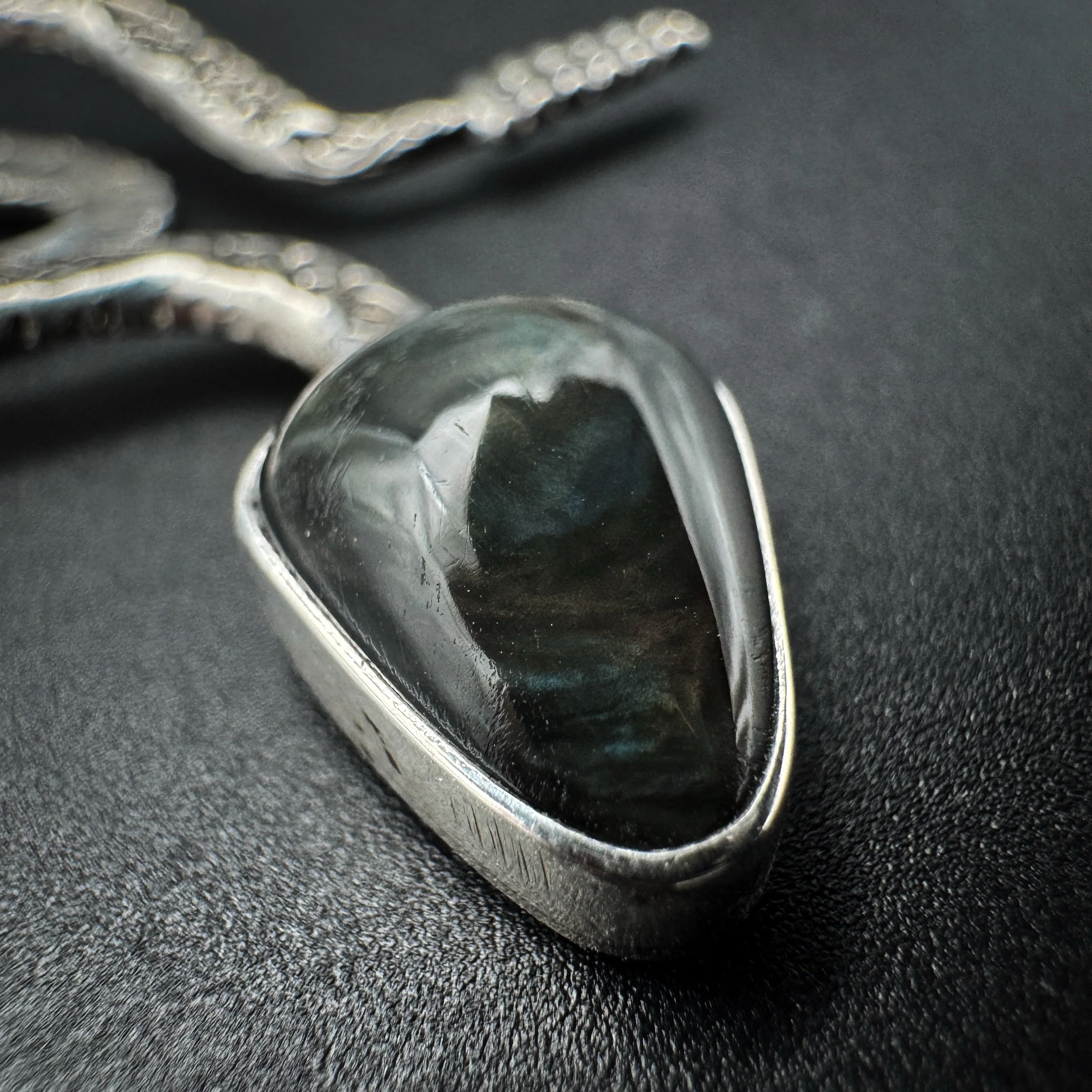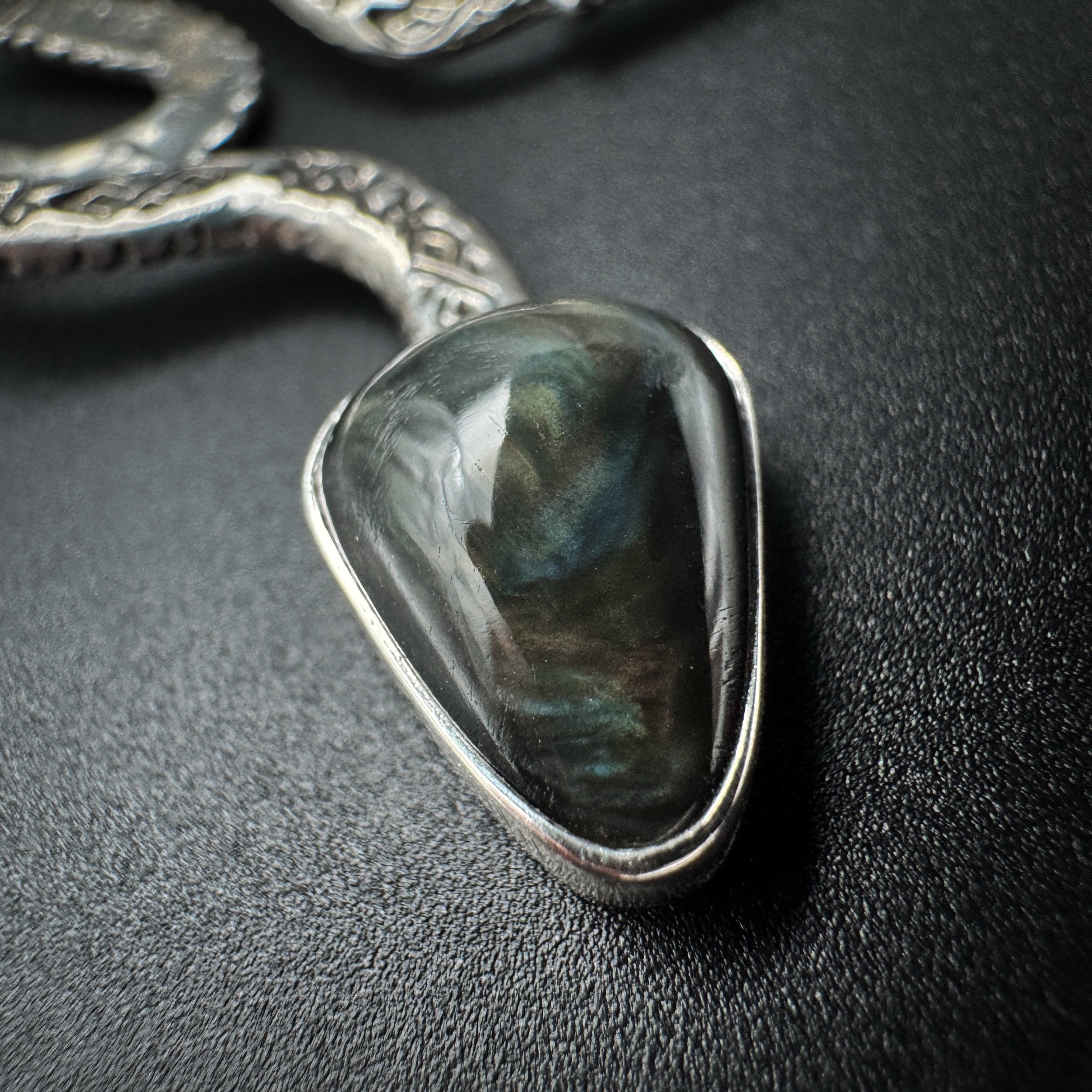 Handmade with solid .925 sterling silver, a .999 fine silver bezel and natural velvet obsidian. This stone is straight-up magic in the sunlight. The inner texture and play of color is unreal.