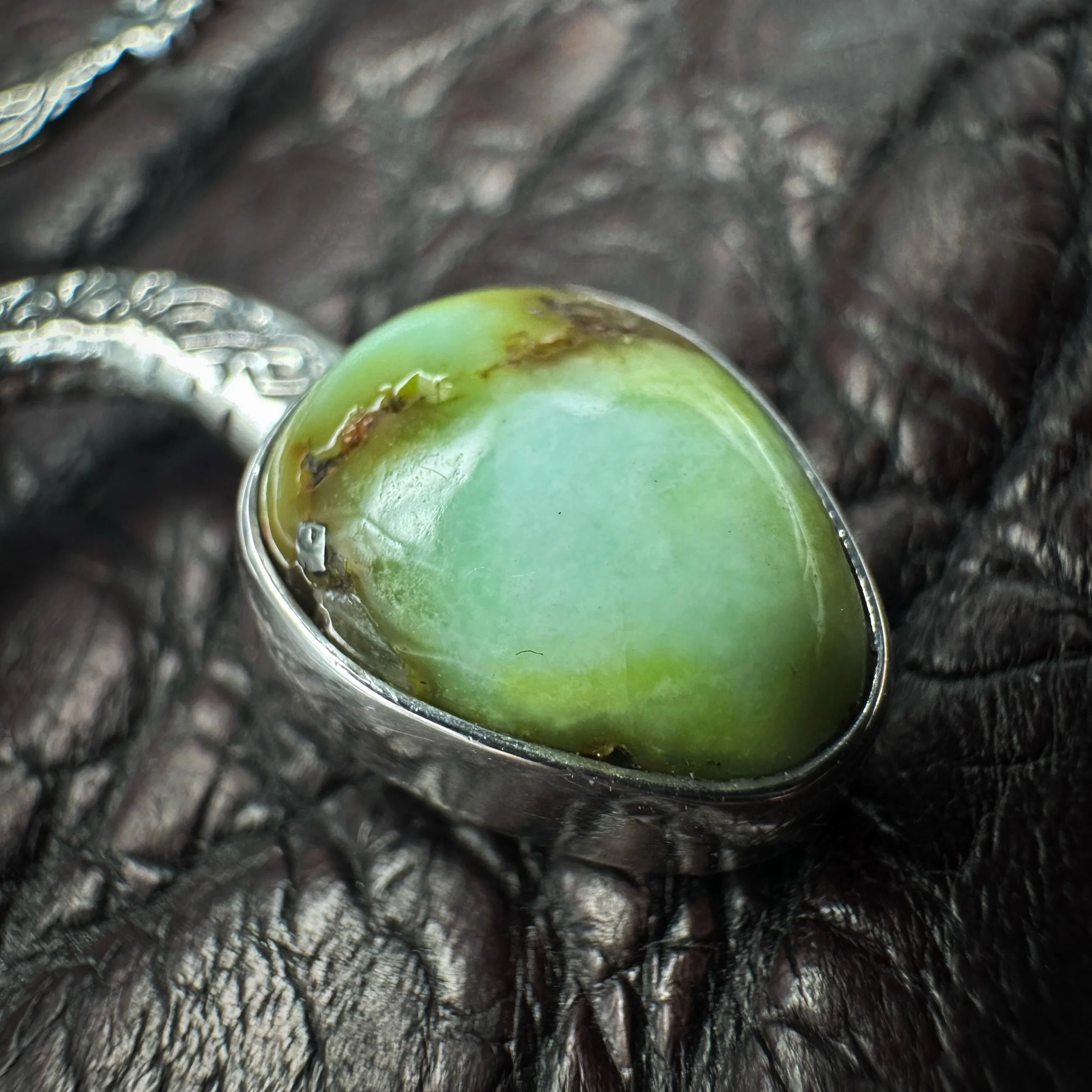 Handmade with solid .925 sterling silver, a .999 fine silver bezel and green Palomino. A small, beautiful pyrite inclusion on the back-left section of this stone is icing on the cake for this one-of-a-kind piece.