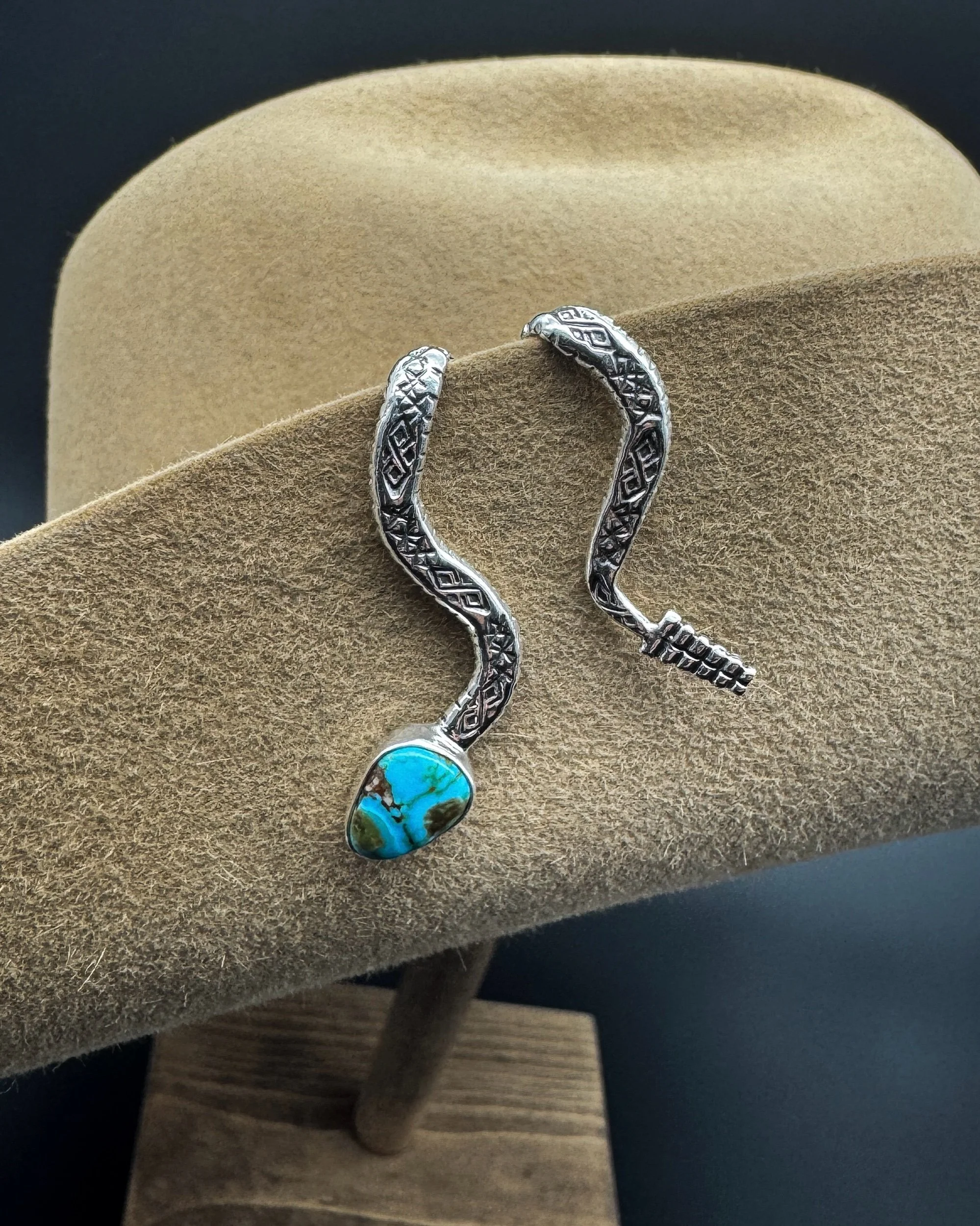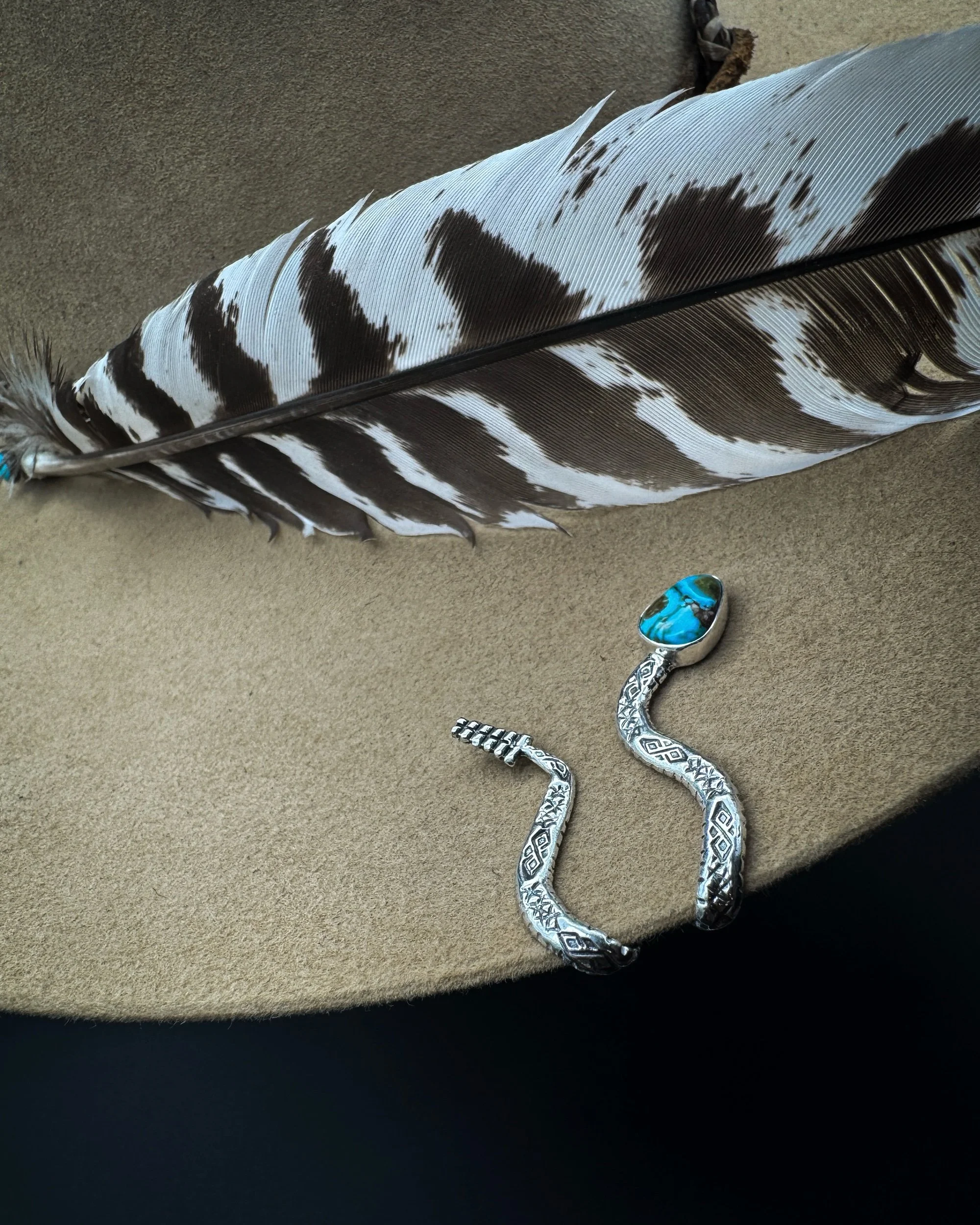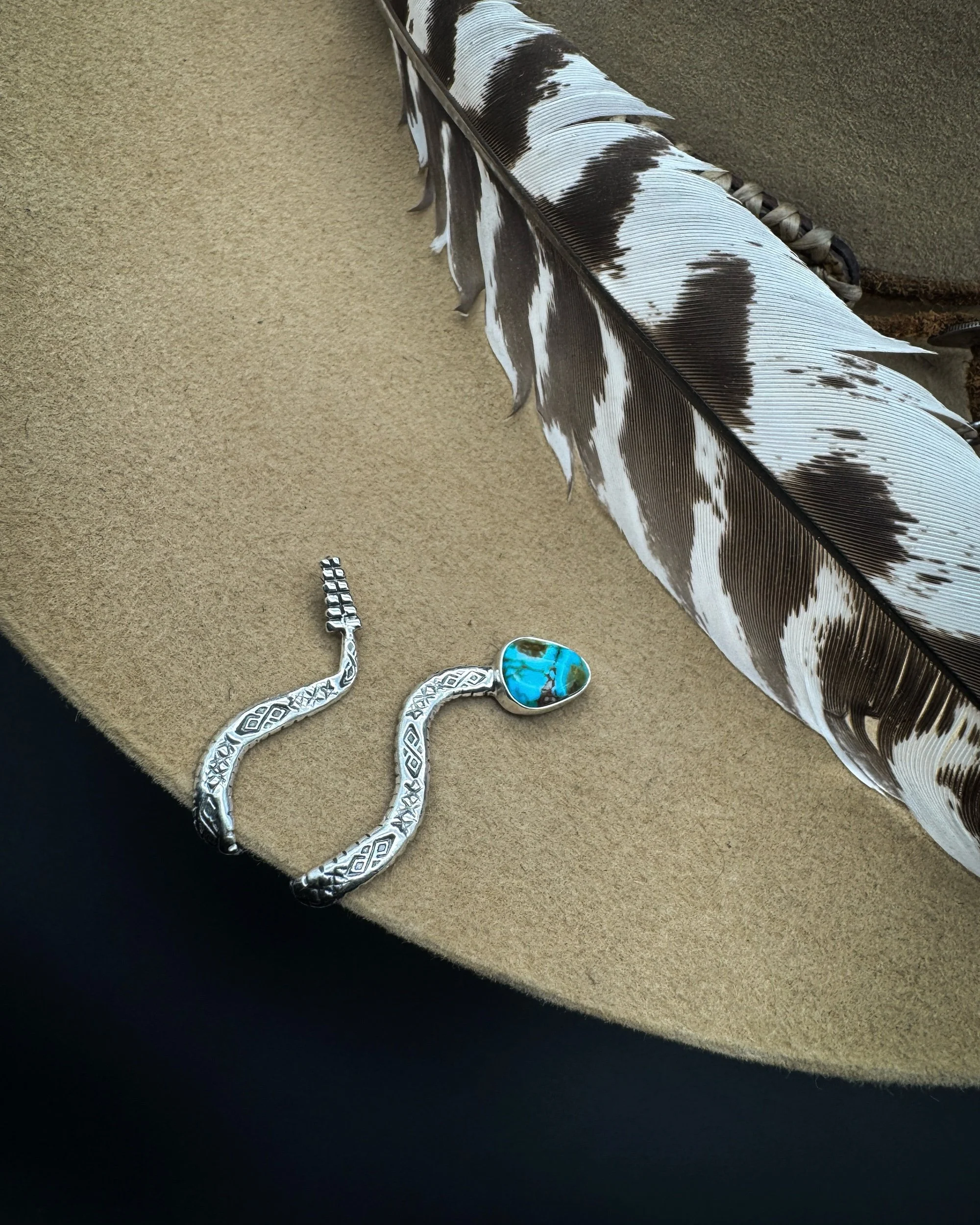 This Brim Biter® is handmade with an incredibly unique and one-of-a-kind piece of polychrome Kingman turquoise, .925 sterling silver body, and .999 fine silver bezel.