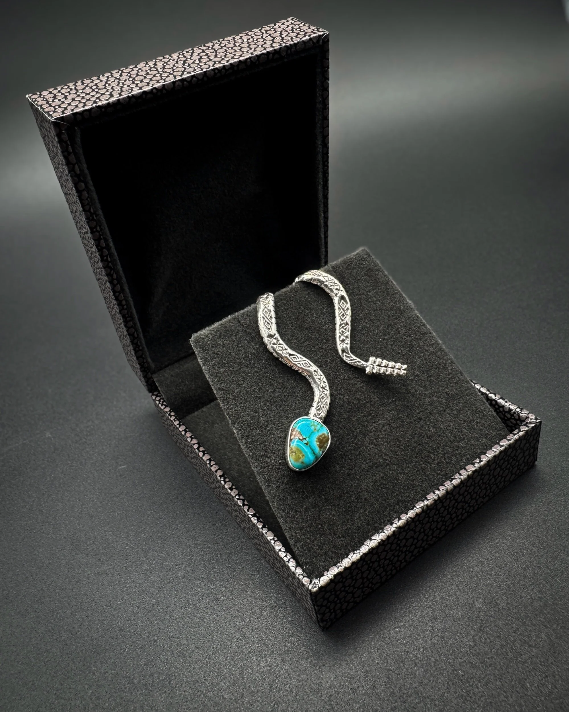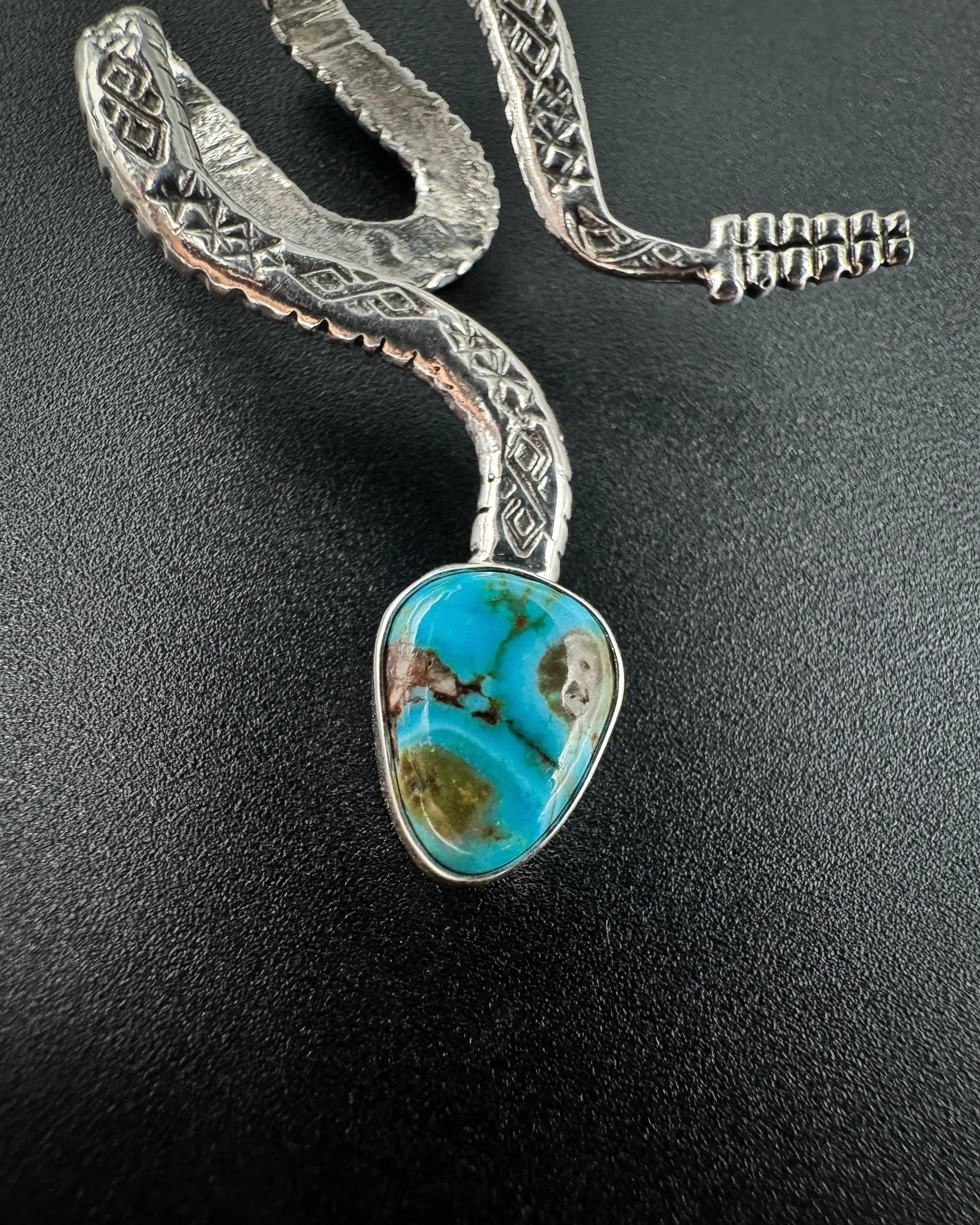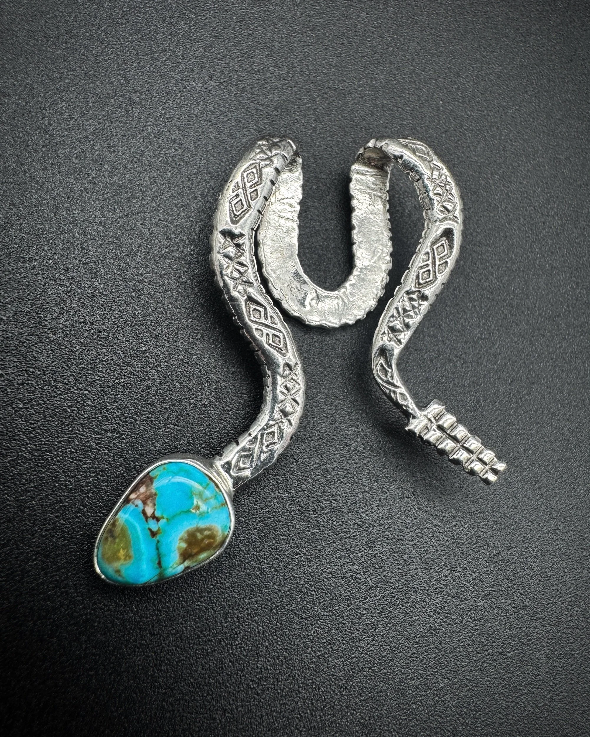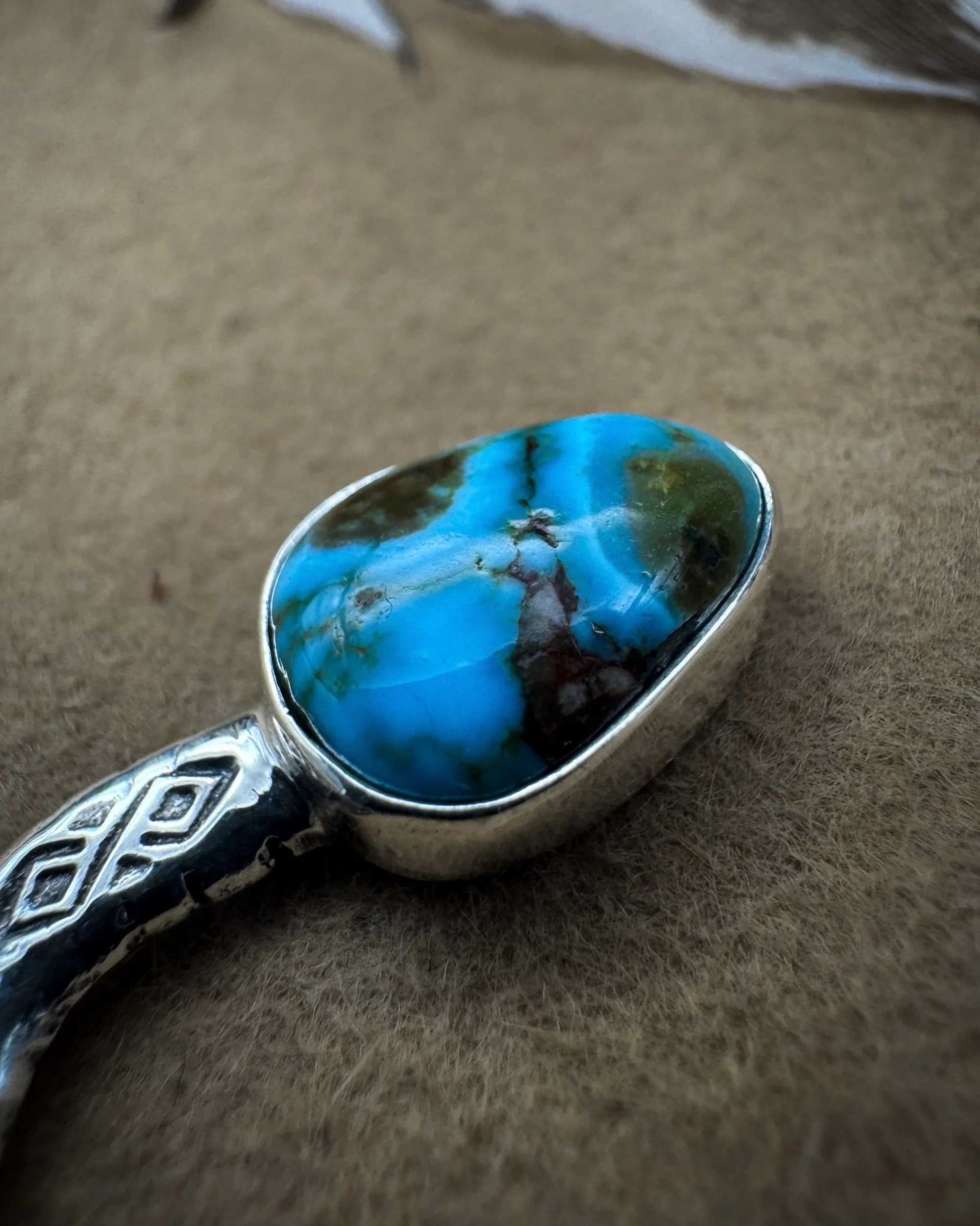 This Brim Biter® is handmade with an incredibly unique and one-of-a-kind piece of polychrome Kingman turquoise, .925 sterling silver body, and .999 fine silver bezel.