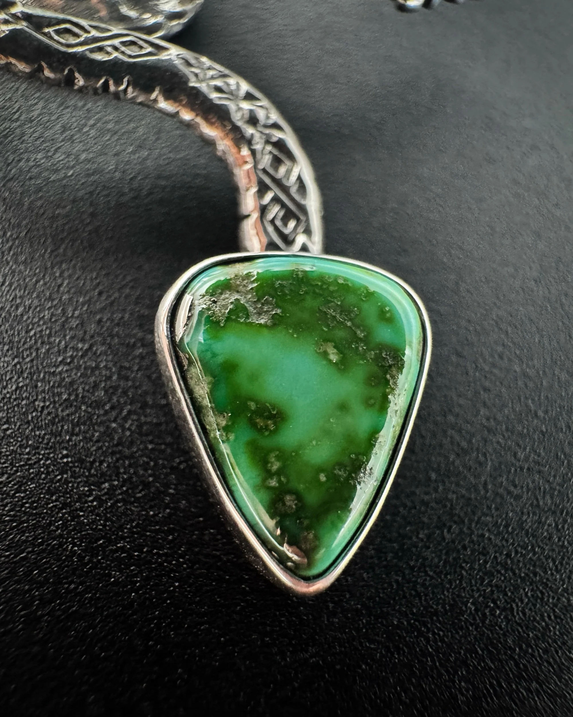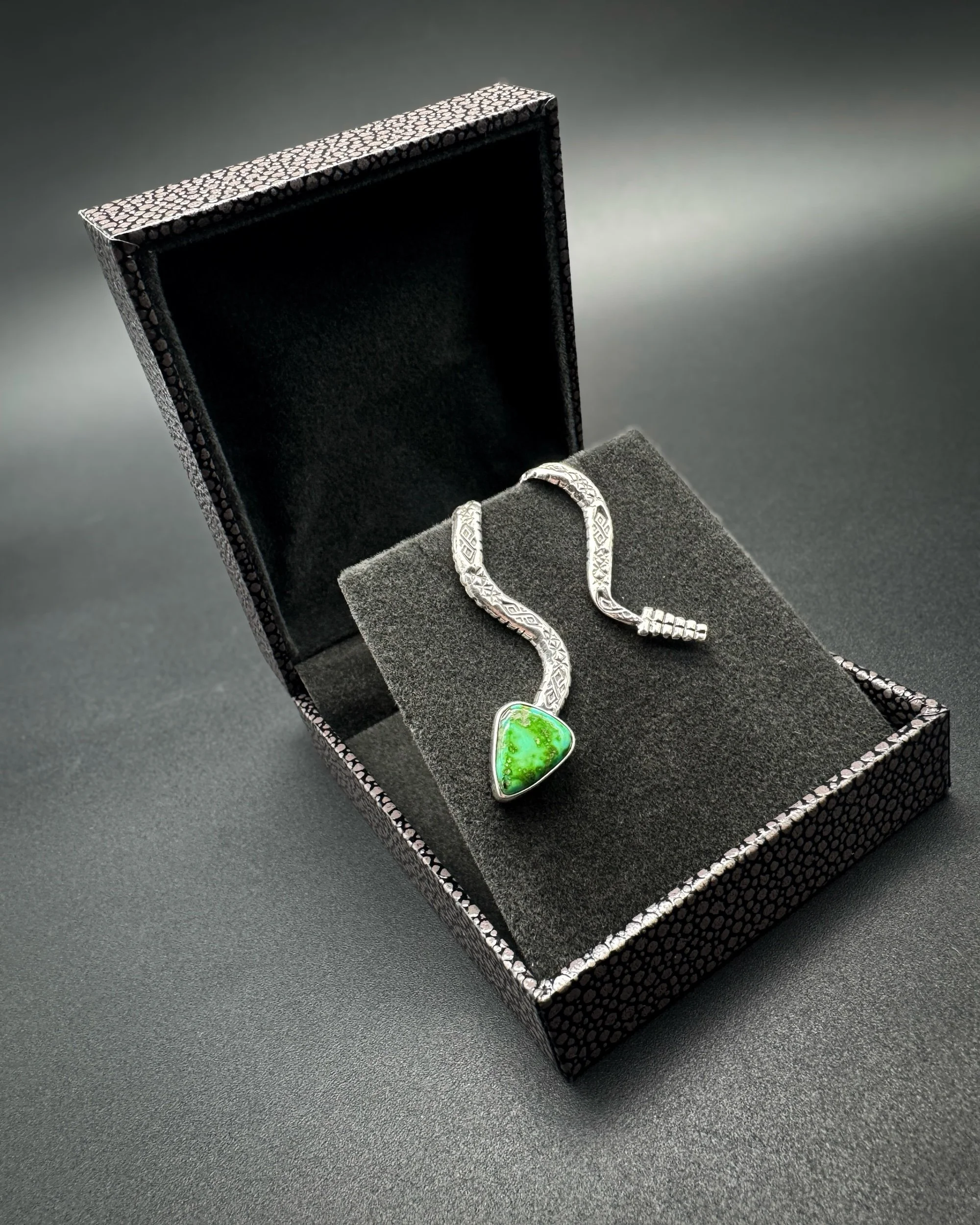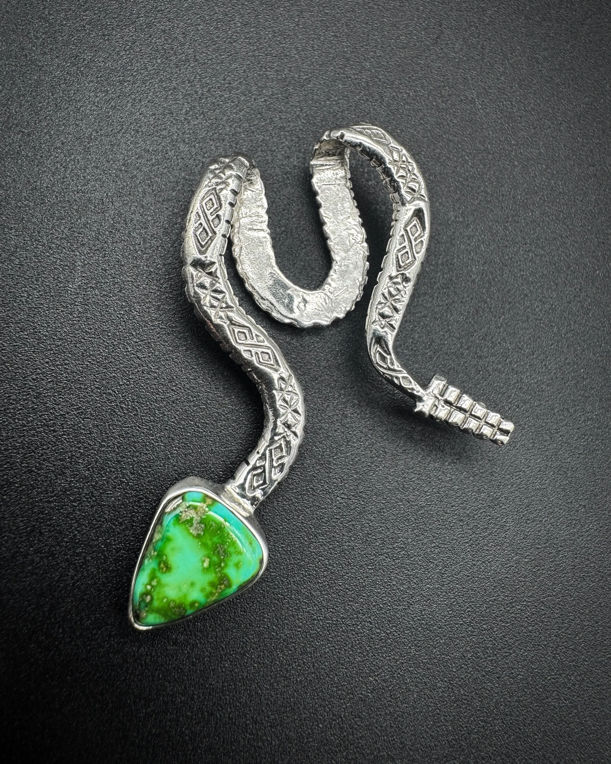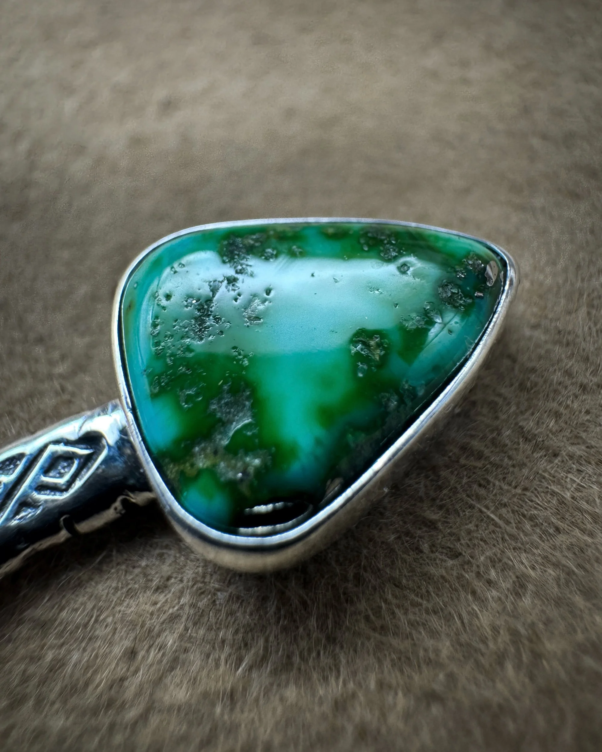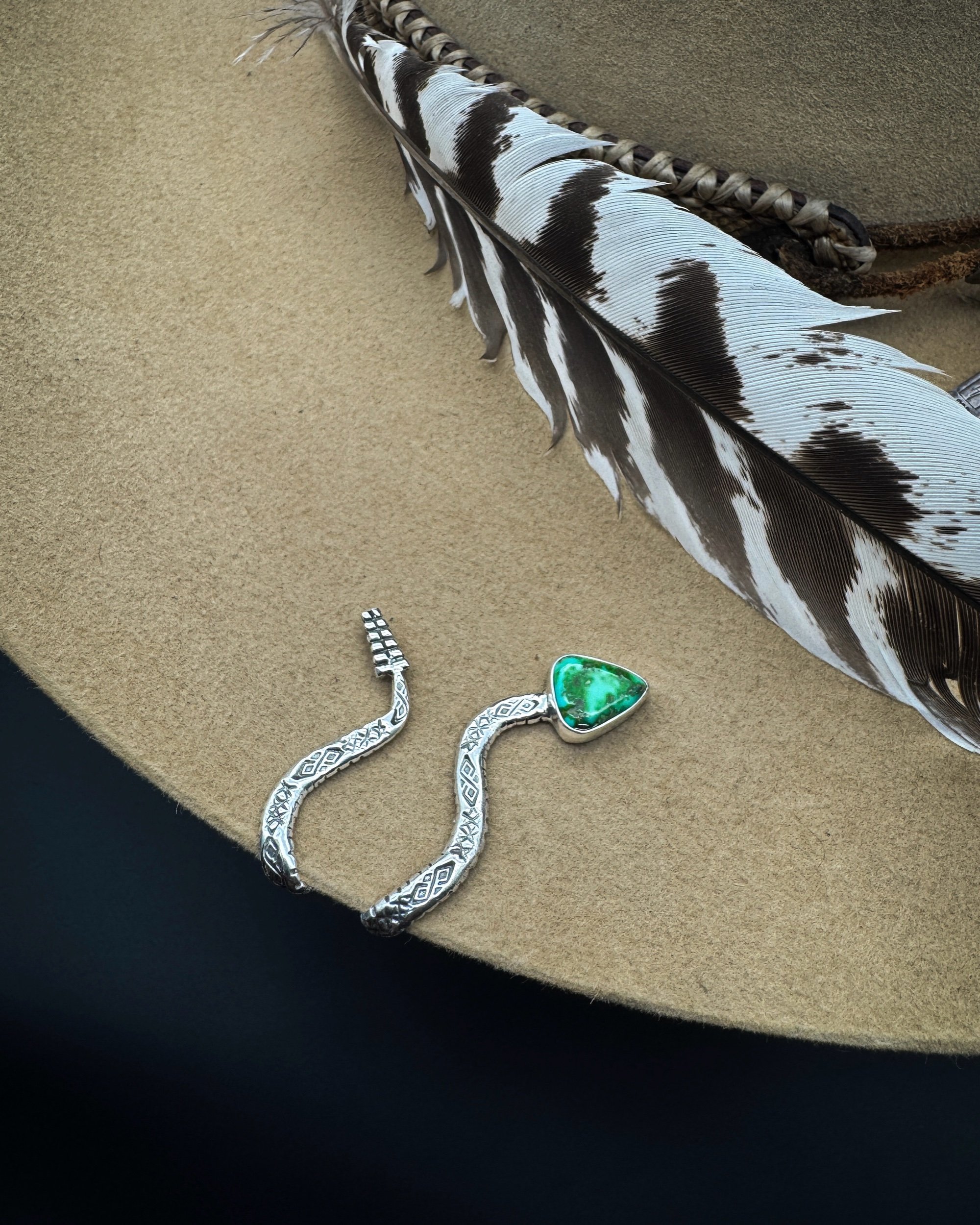 This Brim Biter® is handmade with vibrant green Sonoran Gold turquoise, .925 sterling silver body, and .999 fine silver bezel.